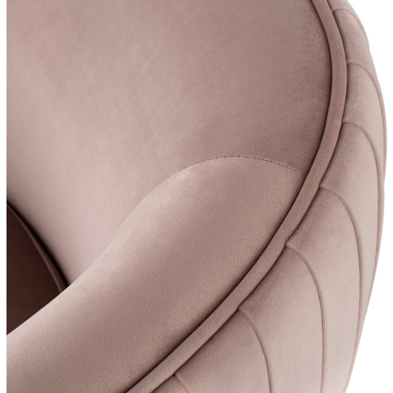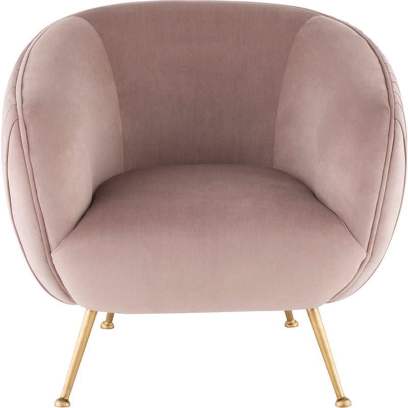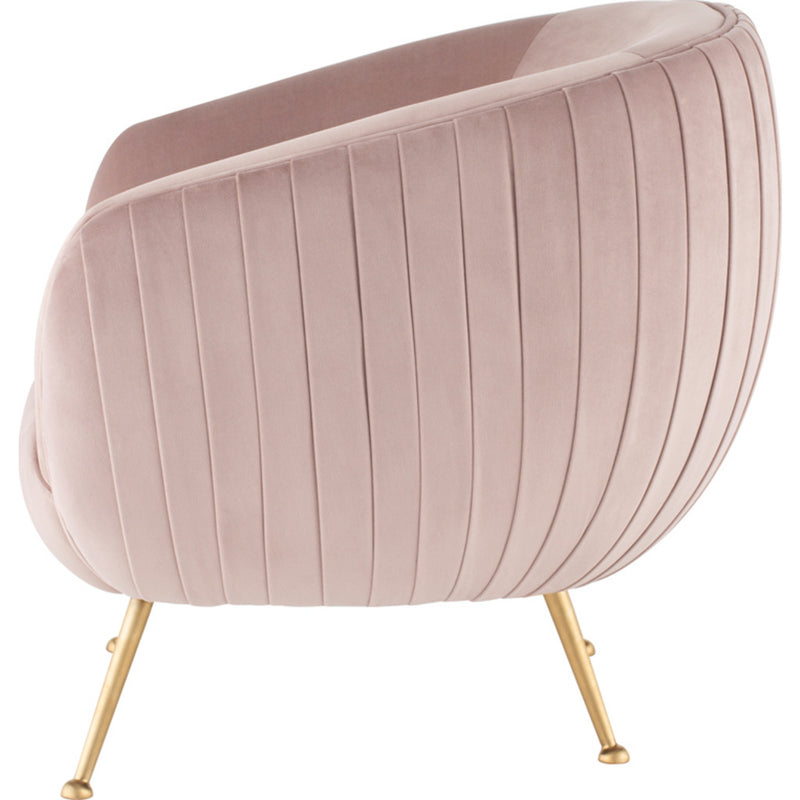 The Sofia occasional chair features a rounded profile upholstered in pleated blush velour, finished with pin brushed gold legs.