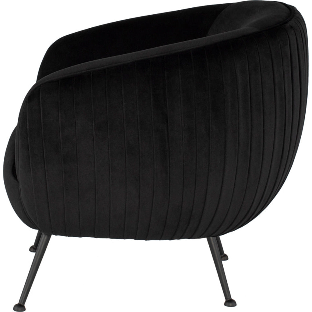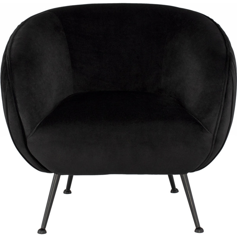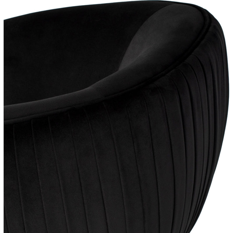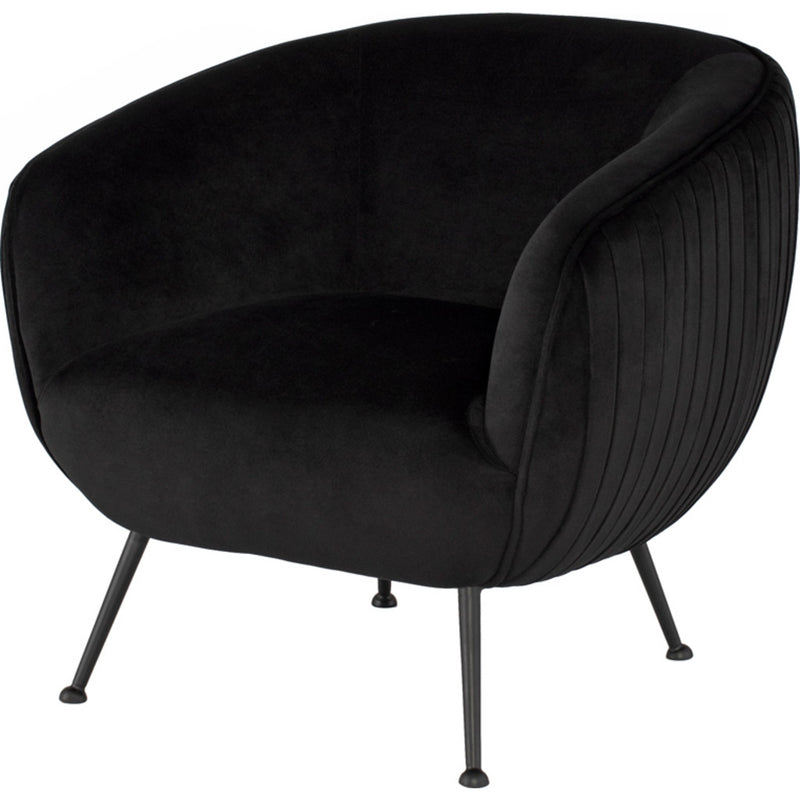 The Sofia occasional chair features a rounded profile upholstered in pleated black velour, finished with pin matte black legs.