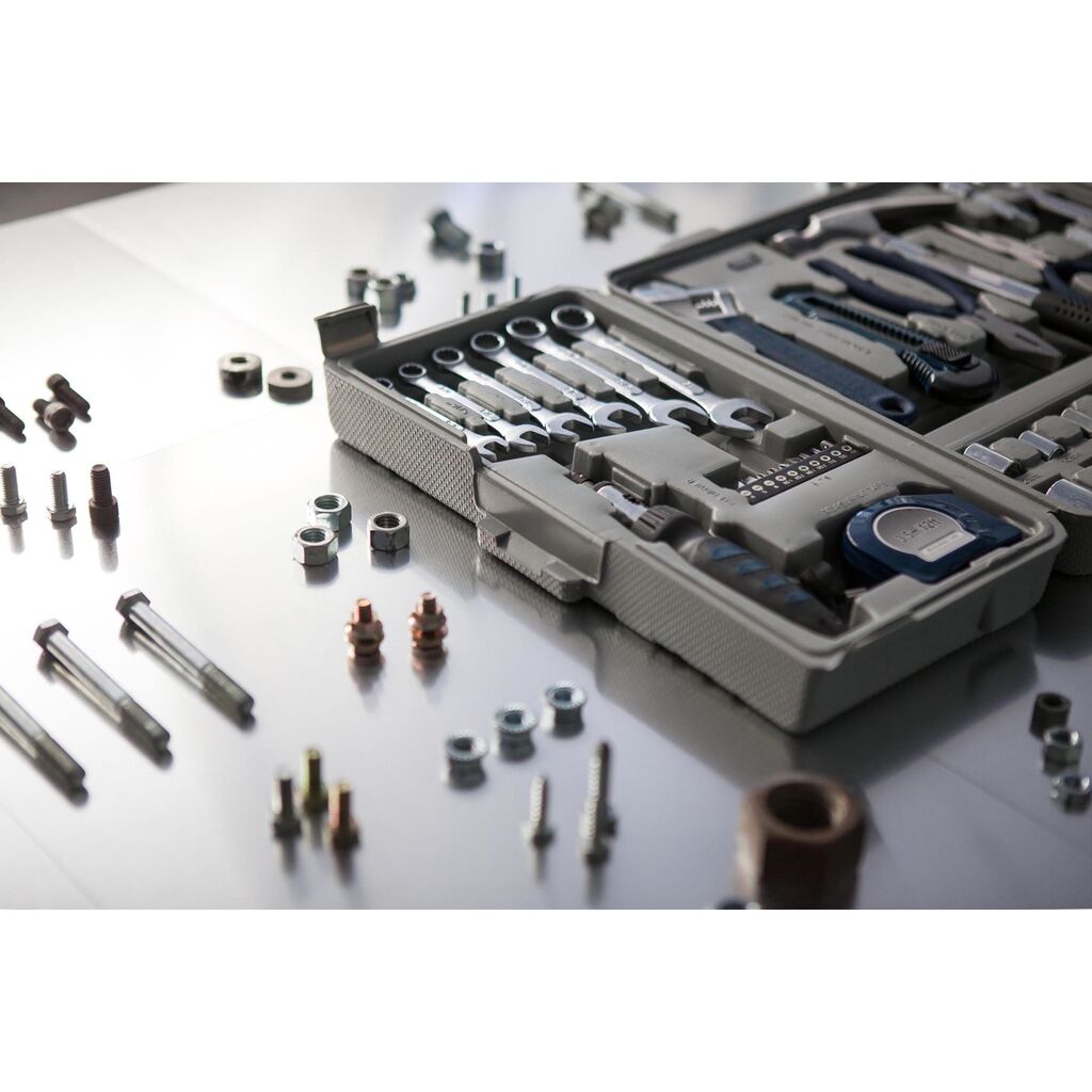 - Includes 22 piece ratchet set, wrenches, hammer, bit driver, screwdrivers, pliers, utility knife, measuring tape, level, 16 piece hex key set, and assorted fasteners