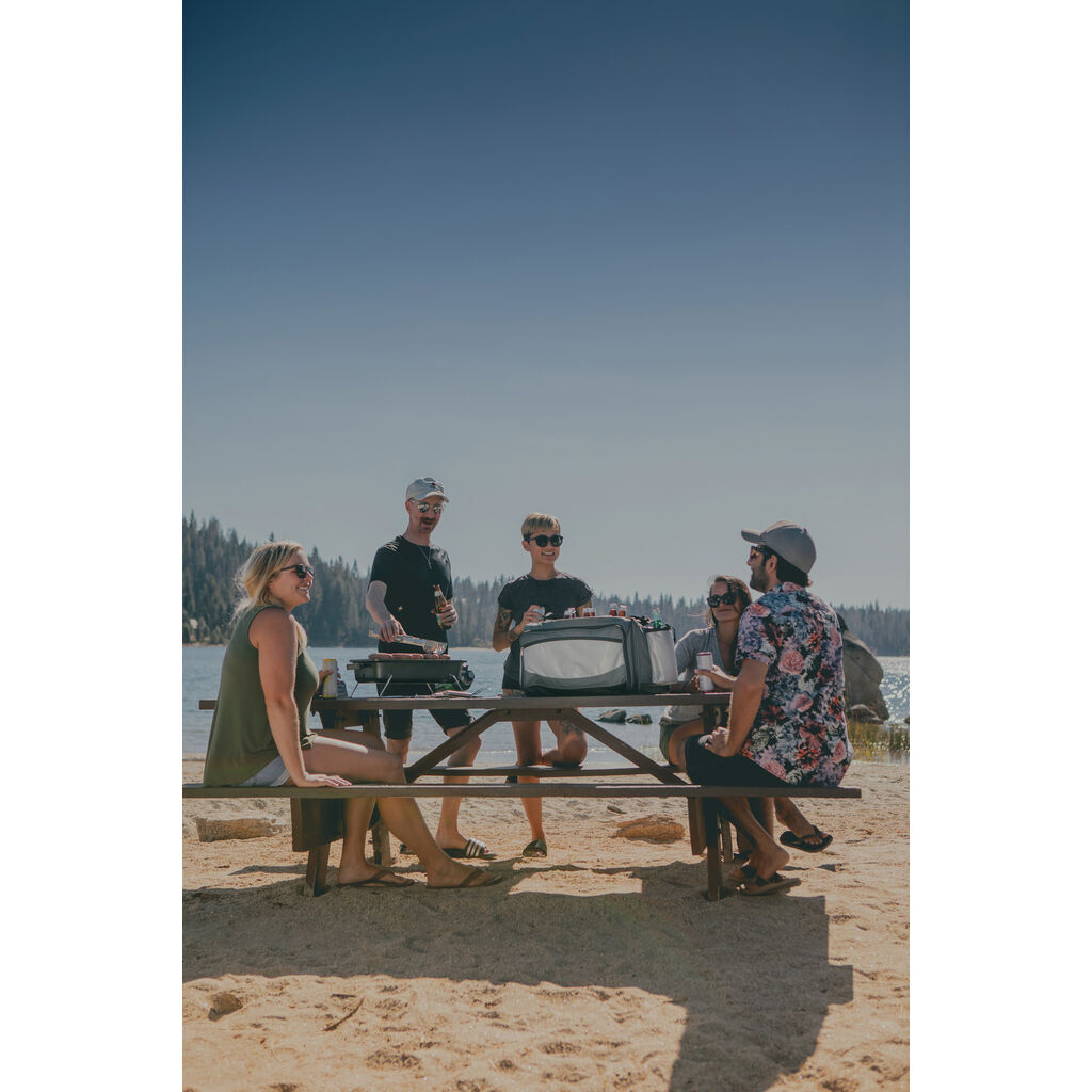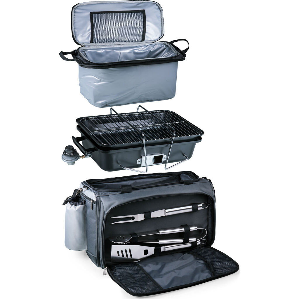 Picnic Time is proud to introduce our patented Vulcan Portable Propane Grill & Cooler Tote, a travel grill set and insulated cooler in one! A 24-can capacity, fully-removable cooler nestles securely into the main compartment which holds the portable LP (propane) bbq grill and lid, and an exterior zip-up compartment holds three stainless steel grilling tools with aluminum handles and non-slip thumb grips including: one large spatula with integrated bottle opener, one bbq fork, and tongs. Exterior pockets with drawstring closures are designed to hold camp propane tanks (not included). With an adjustable shoulder strap with comfort pad, a reinforced waterproof base, three large zippered exterior pockets to store personal effects, padded carry handles, and a stretch cargo cord on the top of the tote to carry a blanket or towel, this BBQ kit will win the tailgate party, hands down!