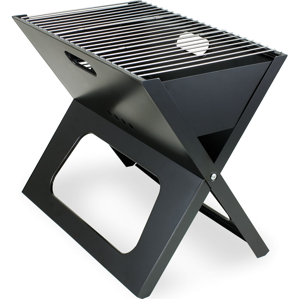 Bring the BBQ wherever you roam with the X-Grill Portable Charcoal BBQ Grill, a sleek, electro-plated steel tailgate grill that packs down flatter than a pancake! This highly-portable folding tailgate grill sets up in seconds with its chrome tri-fold cooking grate and durable polyester canvas carrying tote with shoulder strap. All you need is charcoal/kindling, and friends!