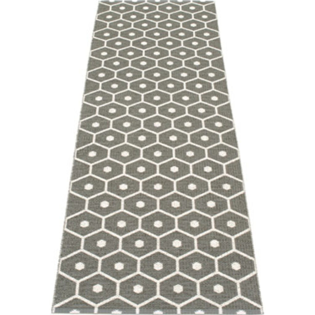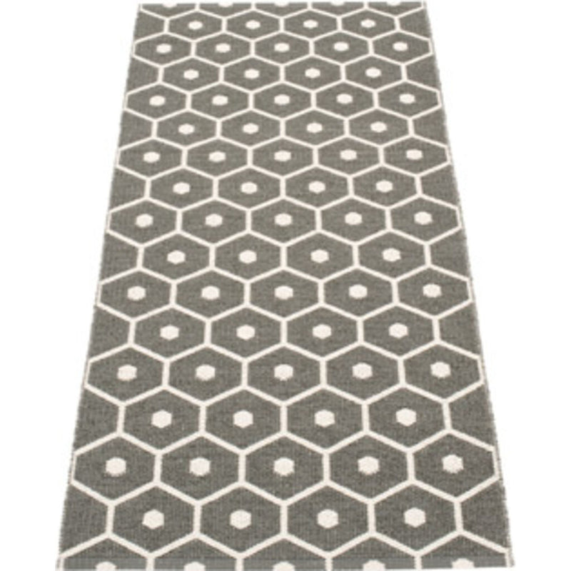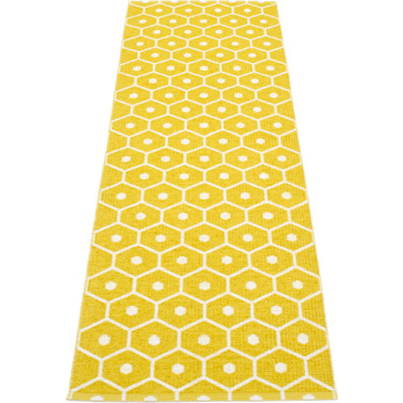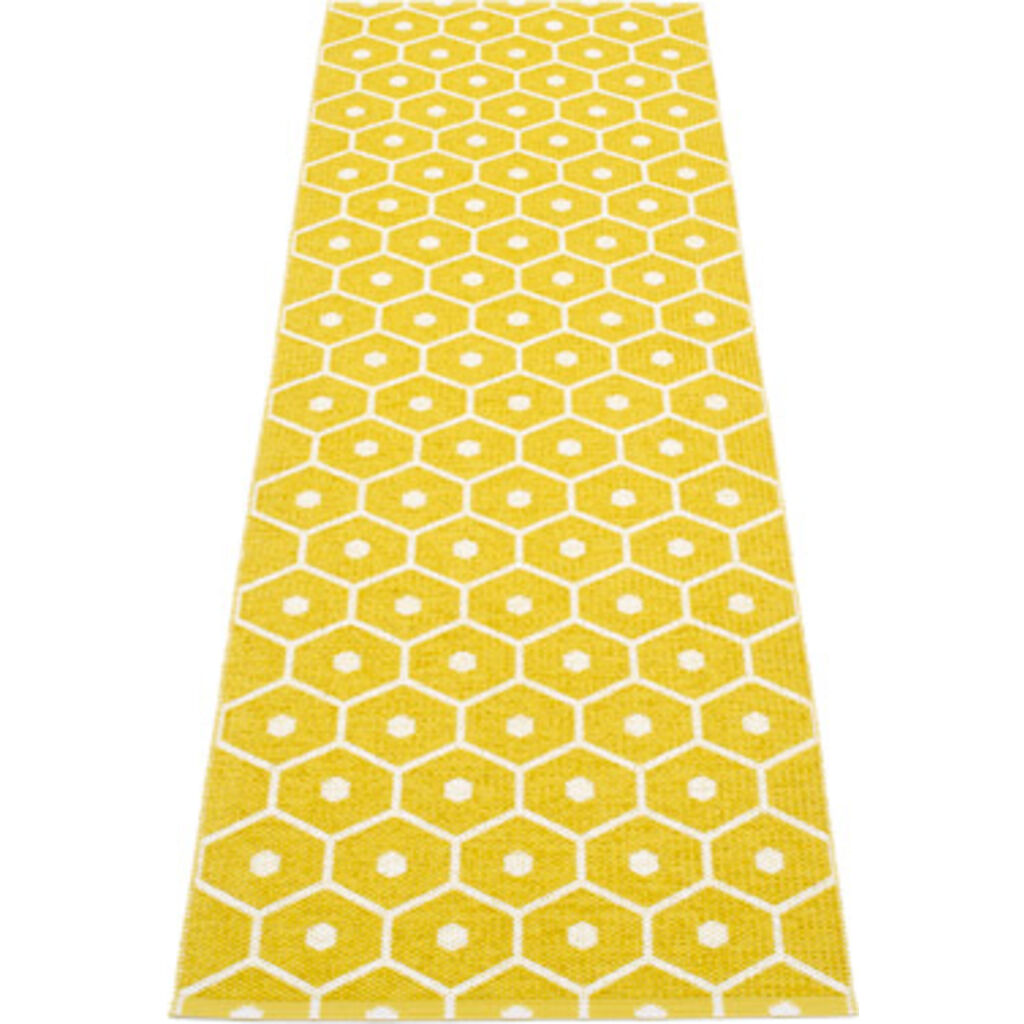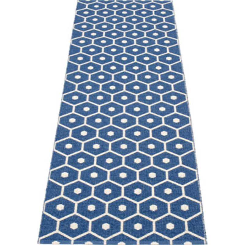 Pappelina Honey is the original plastic rug, crafted with love and pride in Sweden. Pappelina's Rakel rug has graphic pattern is reminiscent of the honeycomb structure of a beehive and spreads a little summer flair. The rug can be turned around revealing the same pattern in reverse colours. Woven by hand and brought to life through a close interplay between design and weave. Woven on a traditional loom using wooden shuttles. Non-absorbent and hypoallergenic, Pappelina plastic rugs are easy to clean and machine washable at 30°C. These are woven using two colours together to give a subtle colour combination. Very practical and easy to care for rug in Swedish manufactured, certified PVC. Double folded hemmed edge with strong seam and sewn rubber label. Measurements may vary ±4% as a result of the various craft processes during manufacturing. Pappelina rugs can be used indoor and outdoor. Honey rug is ideal for both contemporary and traditional settings. The modern rug with a maritime striped look can be placed on the balcony, on the terrace or in the living room. Pappelina Honey rugs are beautifully styled, longer lasting, easy to clean, waterproof, mould resistant, dust repellent, fibre free and sterile with no toxin content improving life for asthma and allergy sufferers. Go on and feel the benefit!