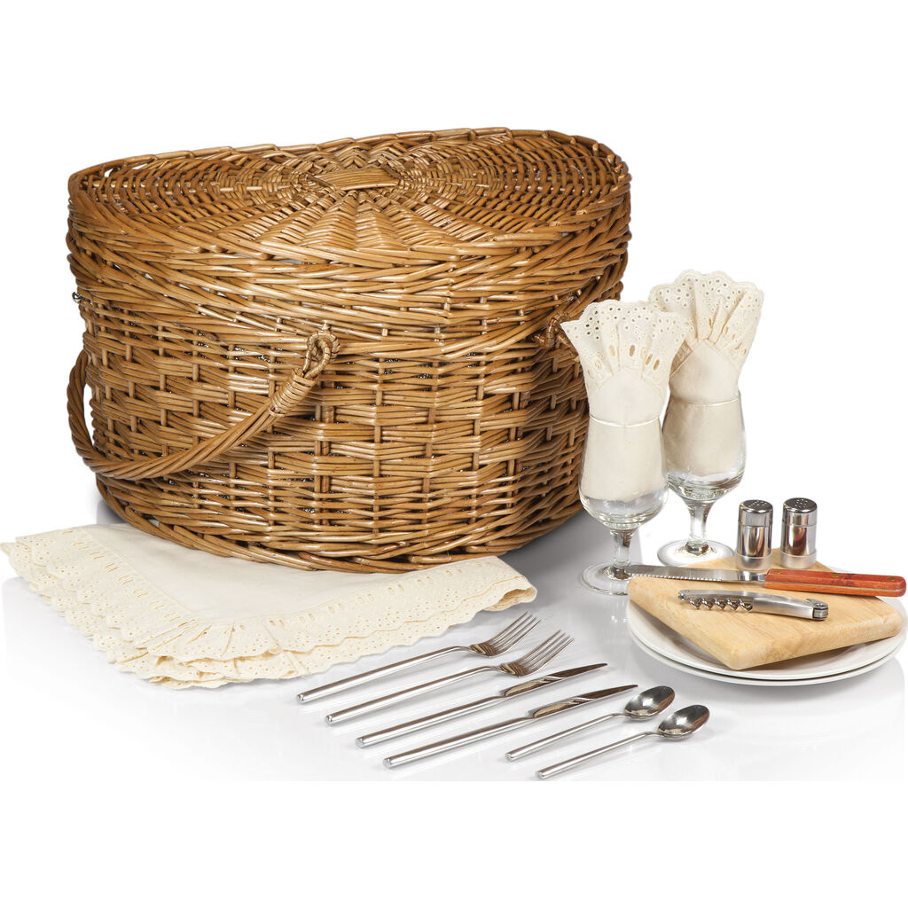 And now for a picnic basket that cuts straight to the chase. The Heart Picnic Basket is a heaping helping of woven-willow romance staring right back at both of you as you enjoy a meal in the park. No pressure, but if your date doesn’t pick up on the obvious shape of this wicker basket, maybe your communication skills could use some assistance. Perhaps the Heart’s picnic set will do the trick. You see, the Heart isn’t just a heart, it’s a picnic basket with accessories. Open it to reveal its impressive, antique-white cotton-lined interior, adorned with deluxe service for two: 2 solid white porcelain plates, 2 hand-blown wine glasses, 2 antique-white cotton napkins with eyelets at the edges, 2 sets of stainless steel flatware, 1 hardwood cutting board, 1 stainless steel cheese knife with a wooden handle, 1 set of stainless steel shakers and 1 stainless-steel corkscrew. Maybe draw attention to the antique-white tablecloth that came with this ridiculously sentimental, heart-shaped wicker picnic basket with accessories. Still no sparks? Yikes! You might actually have no game – but at least you have the Heart Picnic Basket working furiously on your behalf. Keep tryin’, tiger!