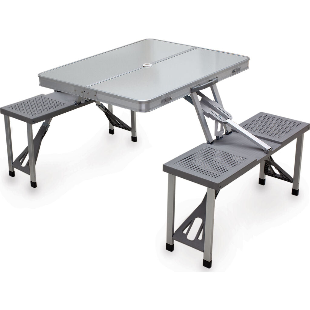- Portable seating for four with integrated table in a folding compact