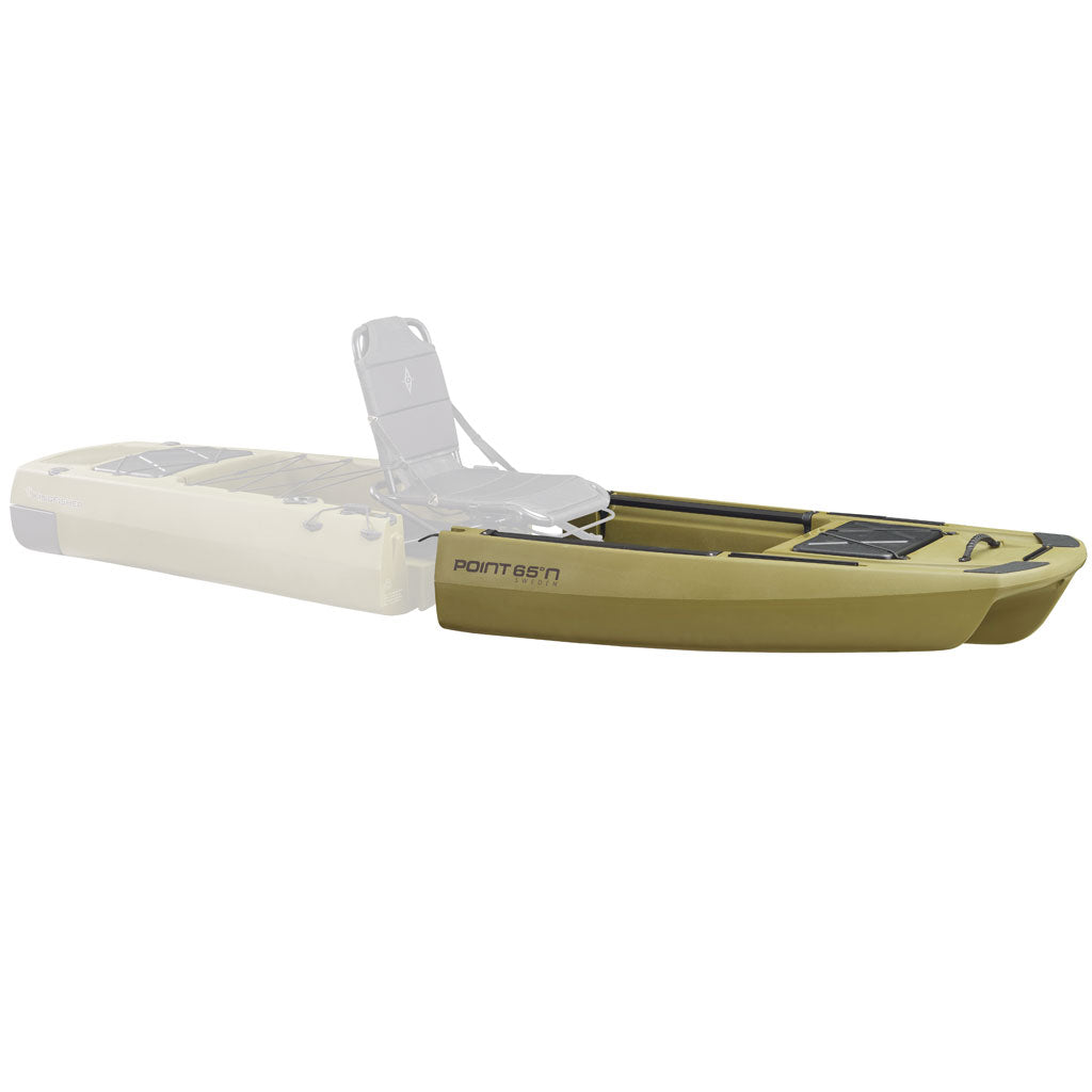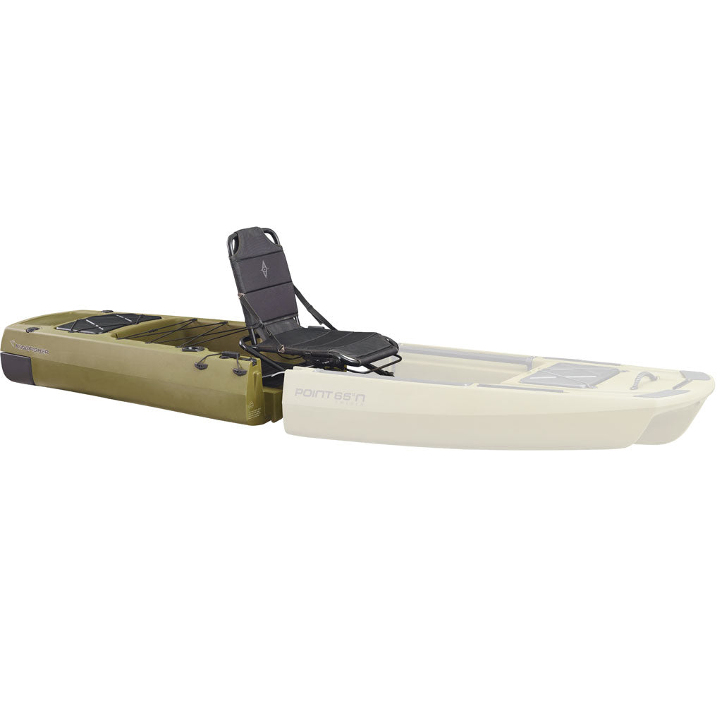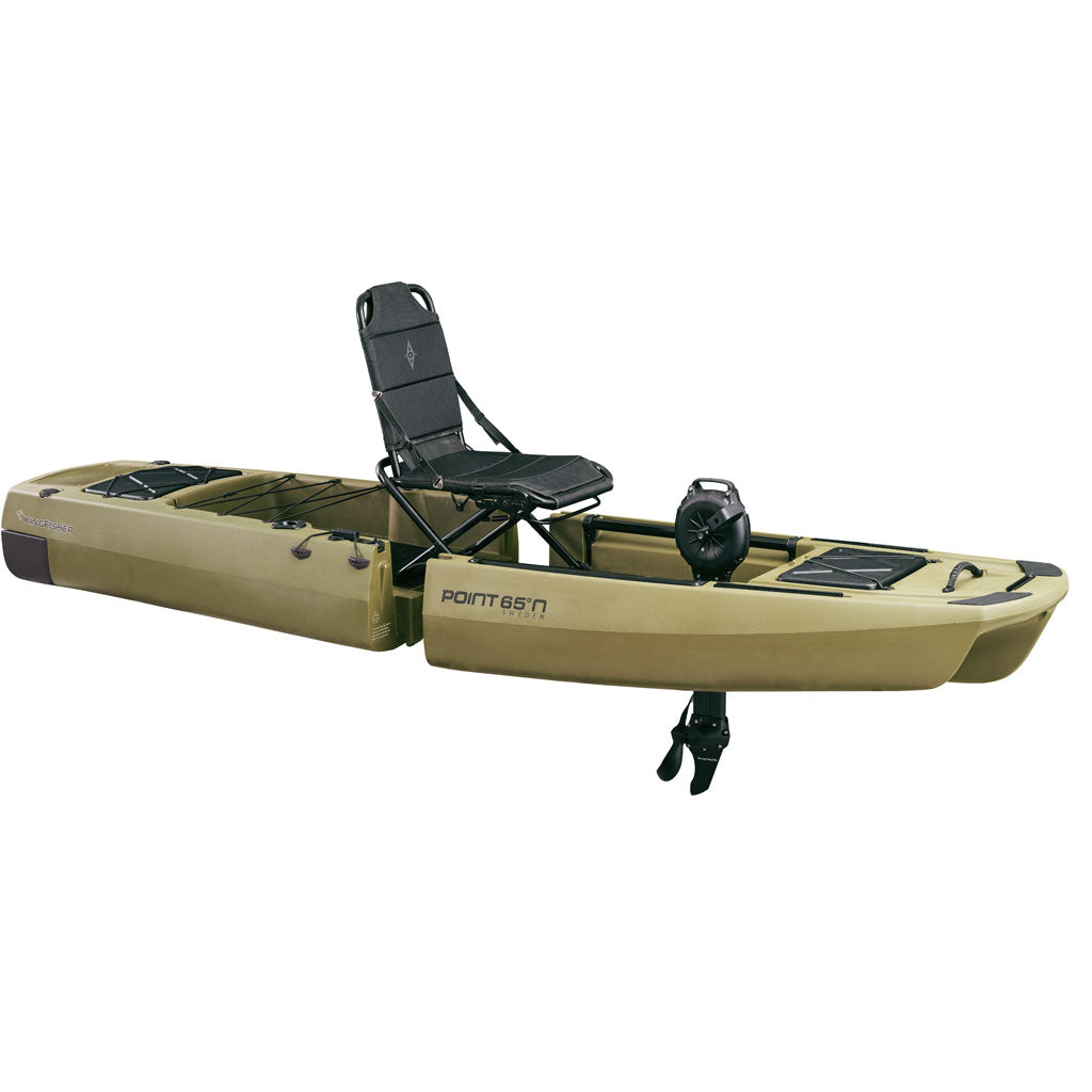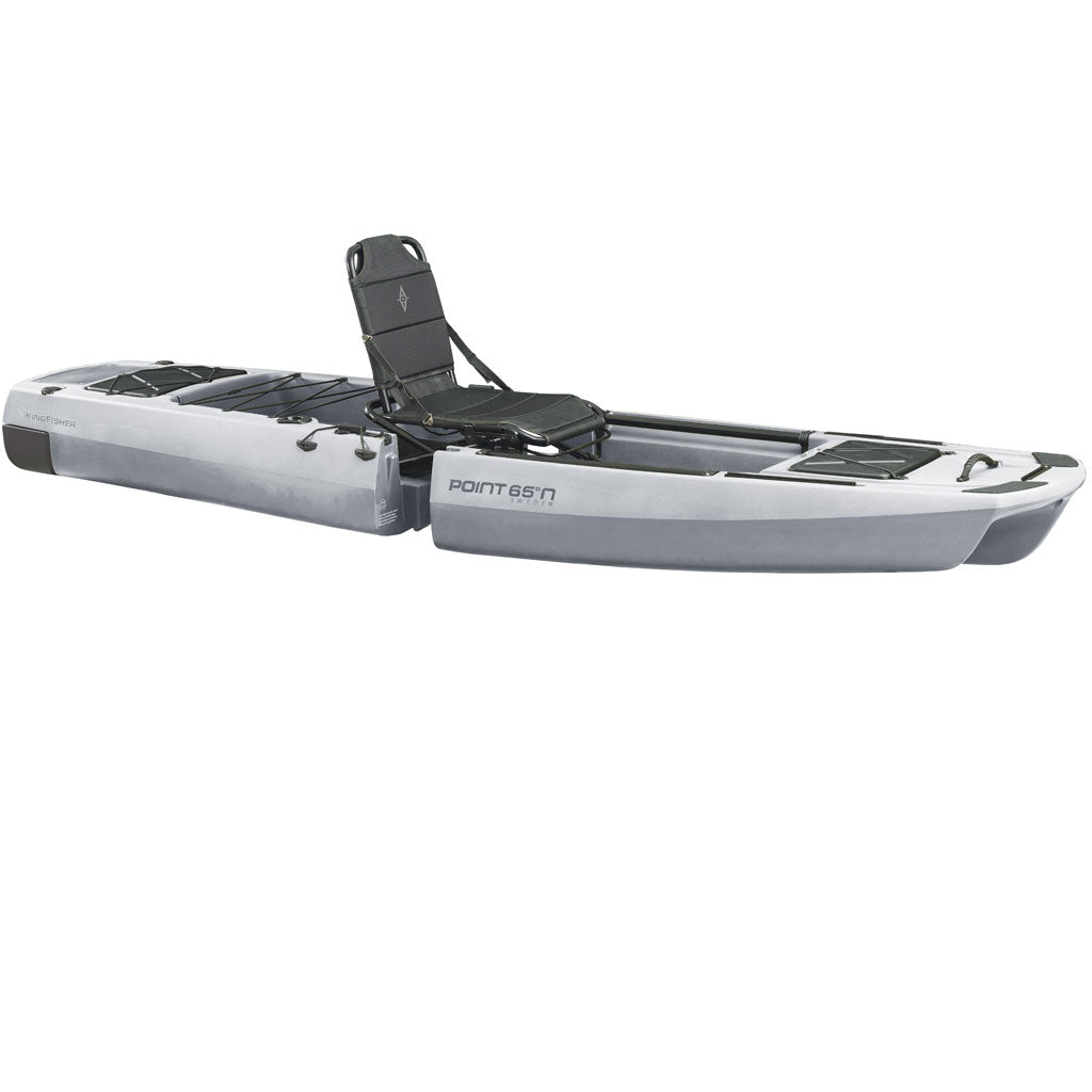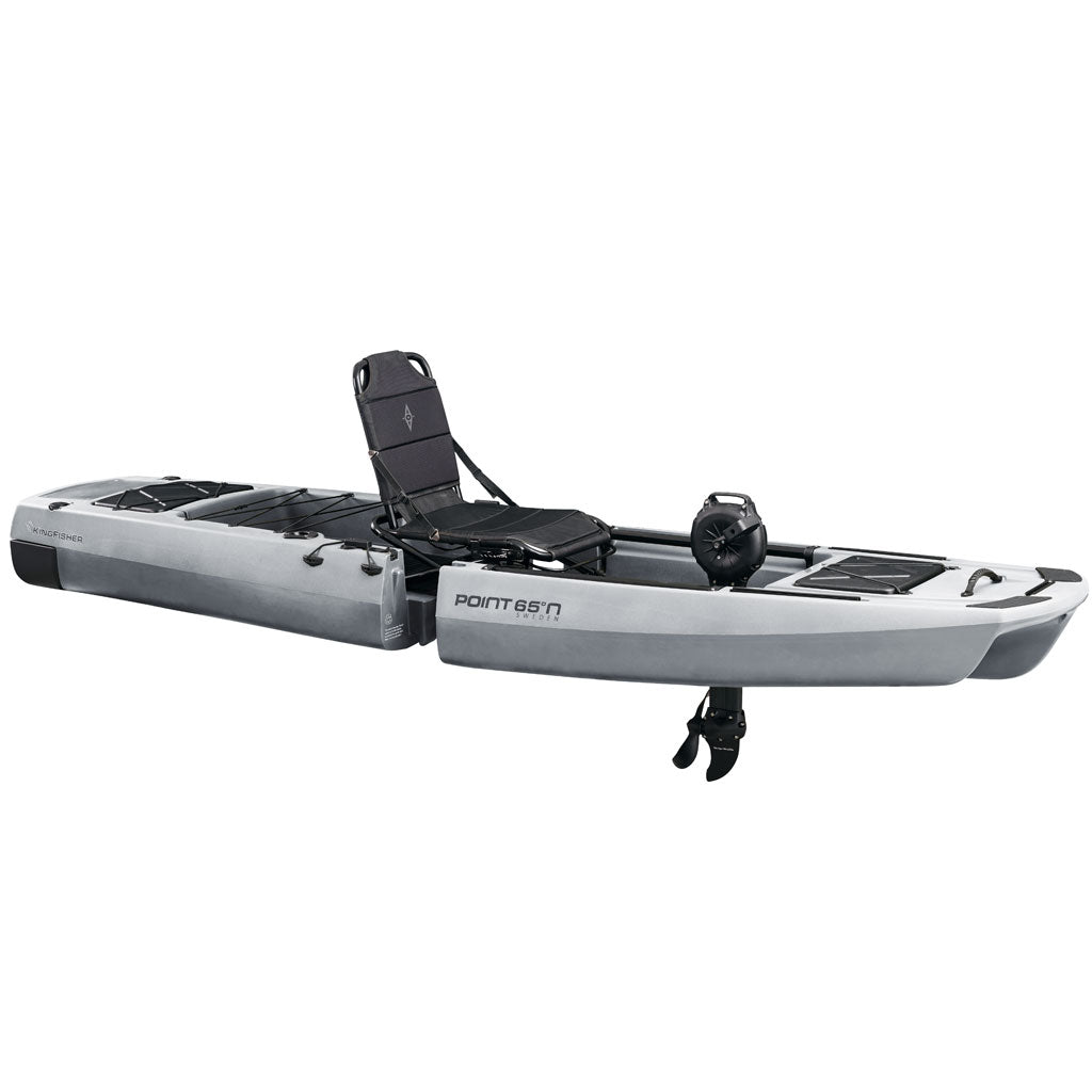 The Point 65 Kingfisher is the most stable fishing kayak ever. With its sleek 31.1" (79cm) beam, the King fisher is narrower than most fishing kayaks while maintaining excellent balance and stability. The hand-controlled, double-sided rudders make it exceptionally easy to maneuver and turn in tight conditions. The kayak can be powered by your arms, legs or an optional motor leaving your hands free to cast and catch your quota. The Kingfisher can be broken down into 2 pieces making it easy to transport from your car to your favorite fishing spot.