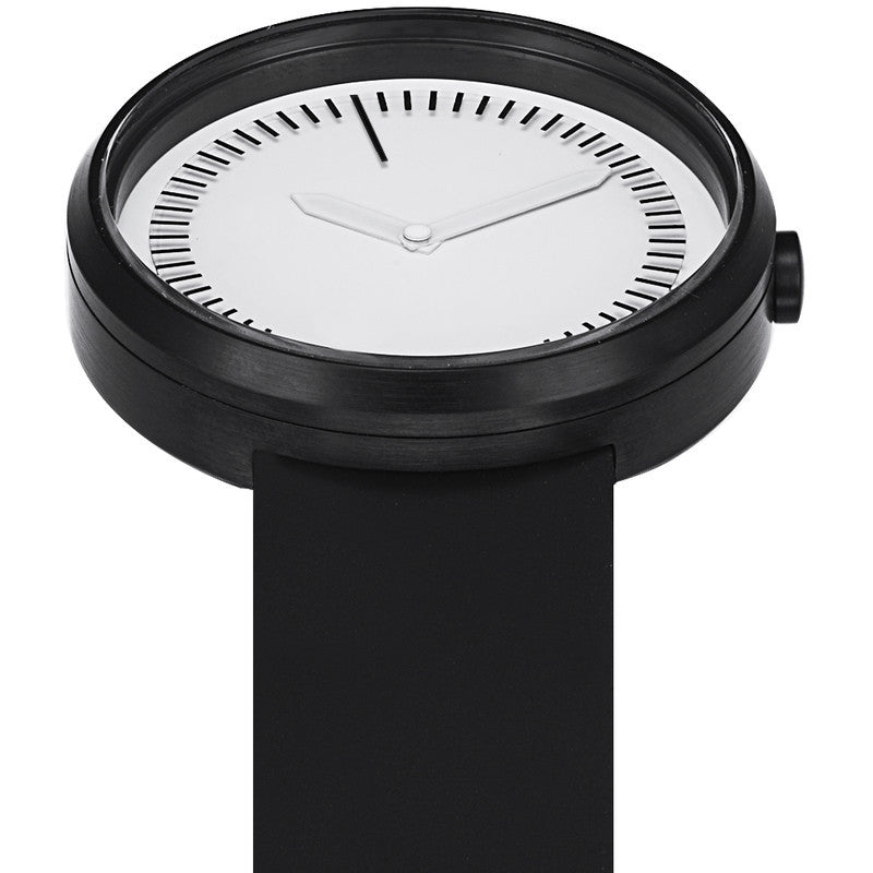 Minimalism in motion. Designer Denis Guidone reflects on the idea of time and moments with the Projects Watches Meantime Watch, interpreted with crisp minimalism. Meantime reminds us that "time escapes with no definitive markings, and in that meantime, it is time that passes". No spare elements added, just a play on black and white with white hands for a power graphic.
