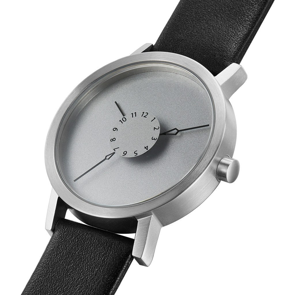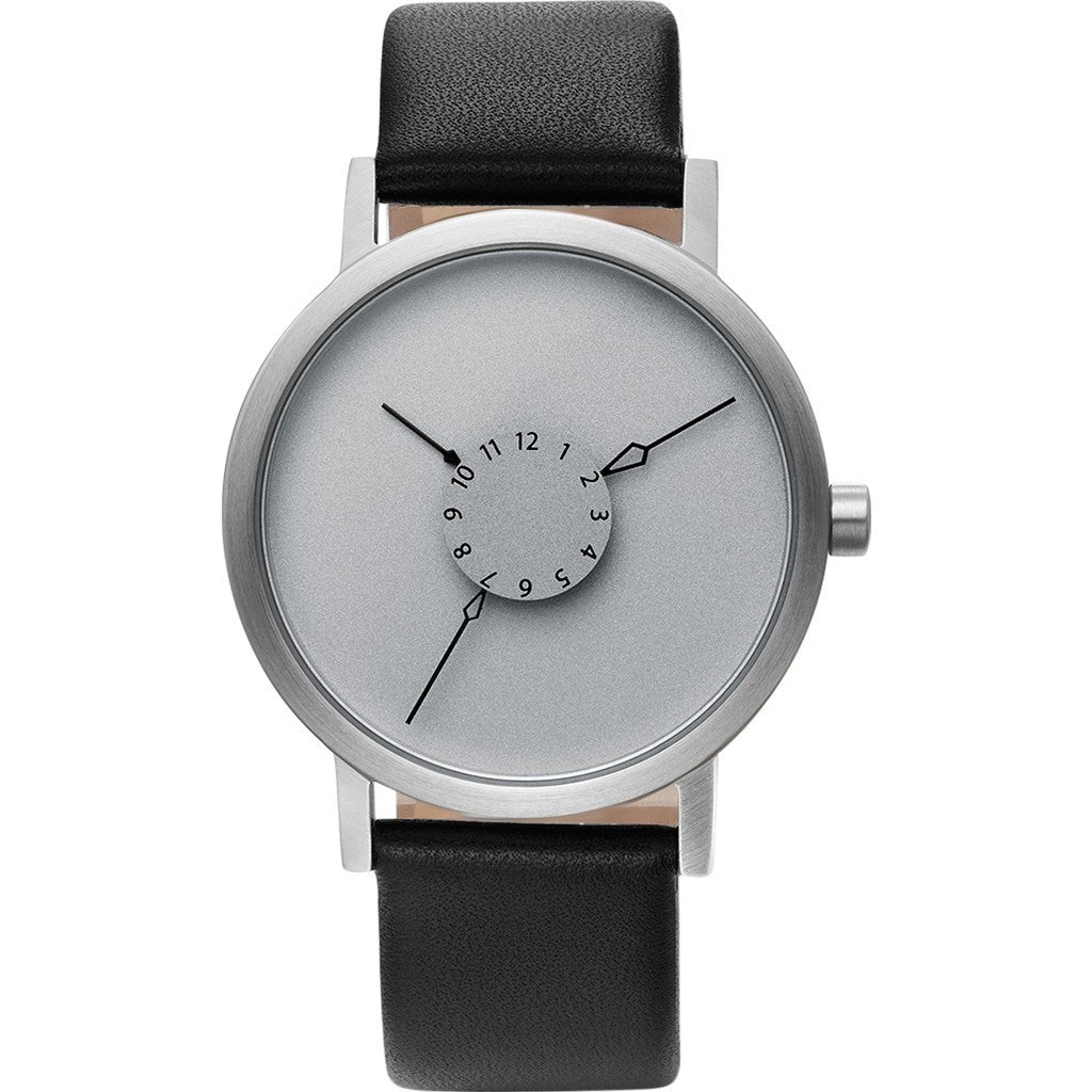 The Projects Watches Nadir Watch is named and inspired after the deepest point on a celestial sphere directly beneath a surface position. Designed by Australian designer Damian Barton, the Nadir watch never strays from the symbolic "core" of time itself.The varied thickness of arrows on the tips of hour, minute and second hands pinpoint the cycle of time on the dial centered underneath the lens. Like its inspiration, time is the Nadir.