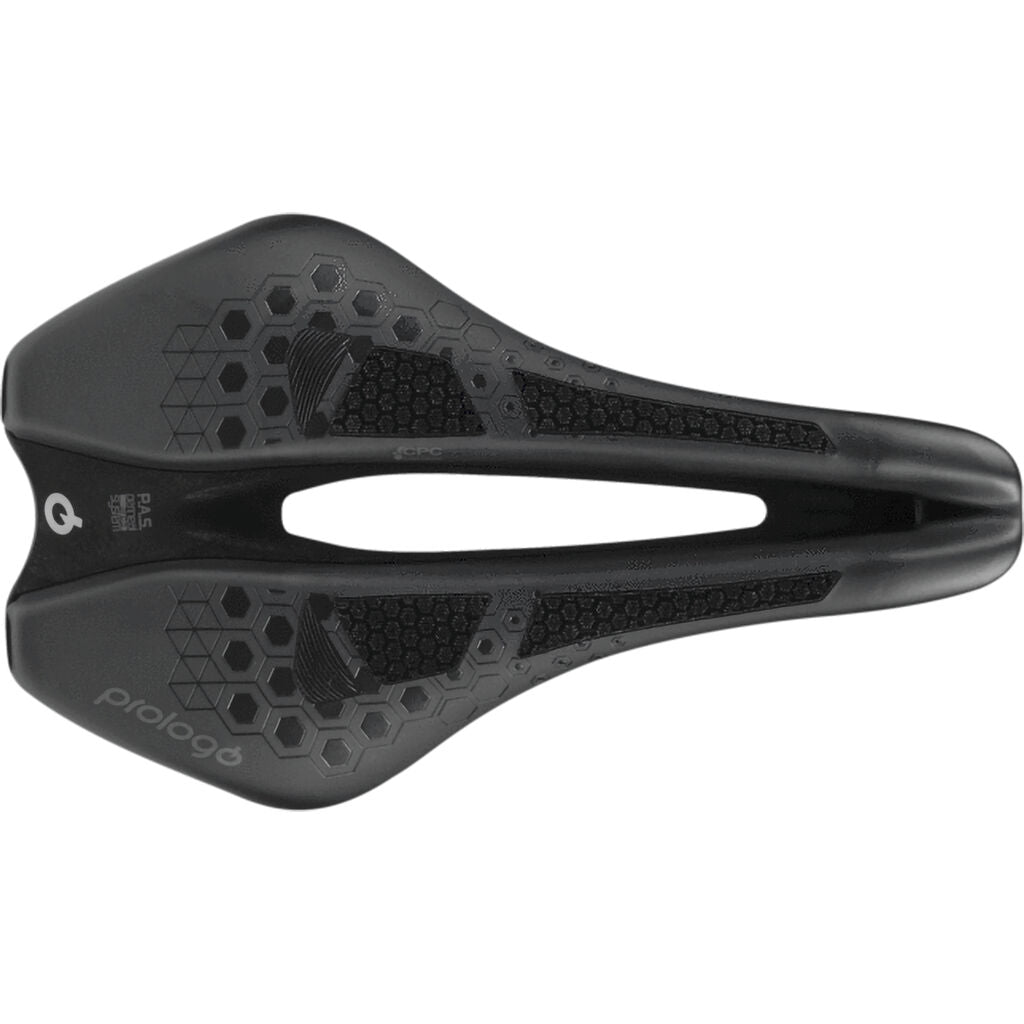 The Prologo Dimension Tri CPC saddle, as the name suggests, has been specifically designed for triathlon and time trial. Its dimensions and weight make it a high performance saddle. Its ergonomic V-shape and PAS perineal channel, modified in width and depth, improves comfort in all phases of pedalling. These features guarantee better blood circulation by eliminating numbness and excessive pressure in the genital area. With this CPC version, "skidding" is also eliminated, improving the cyclist's stability and guaranteeing better aerodynamics. The CPC design creates a suction cup effect that guarantees ideal posture and better aerodynamics.