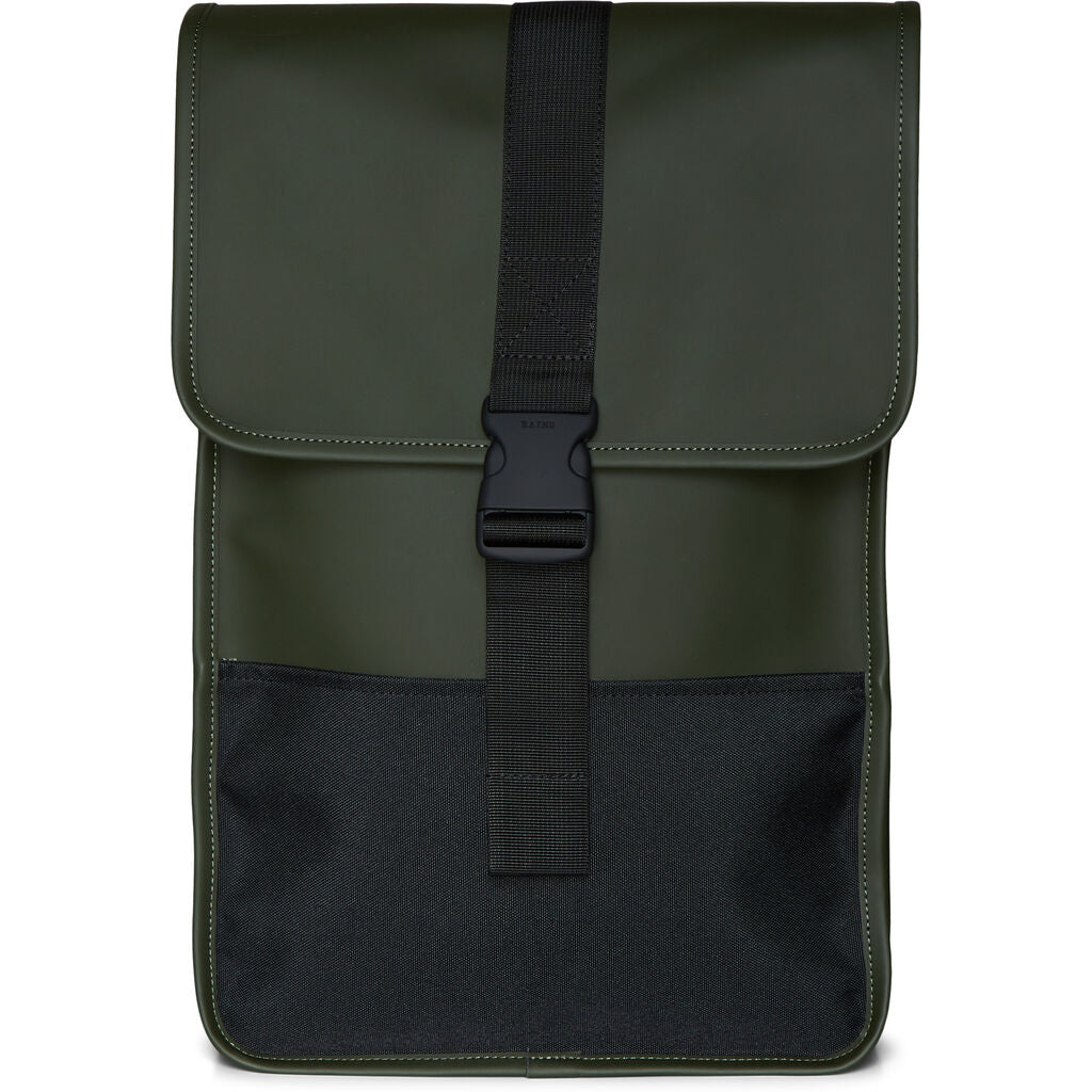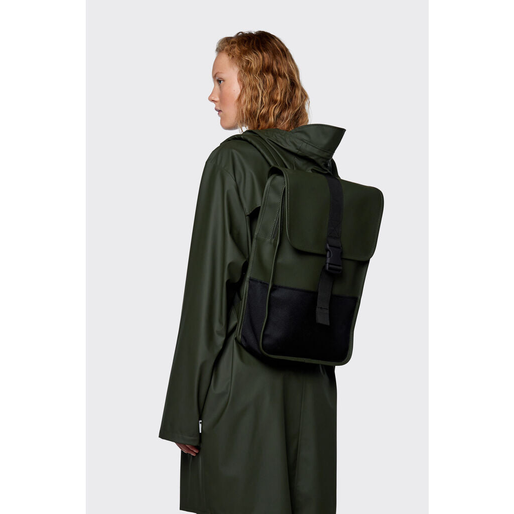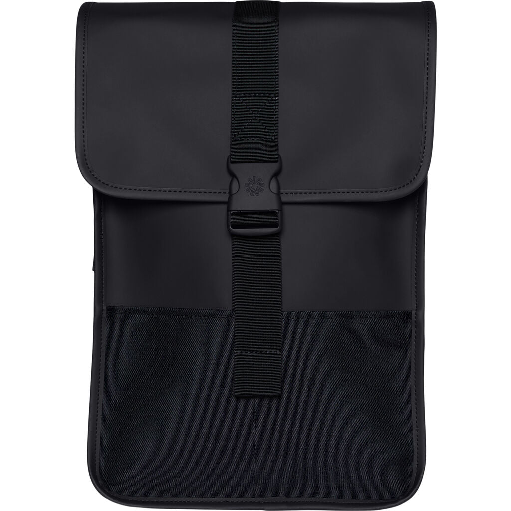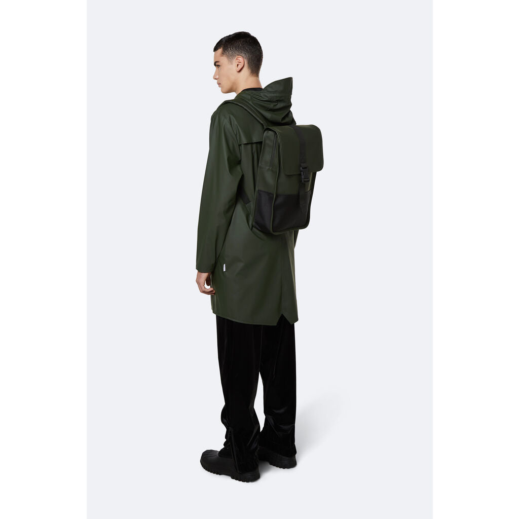 Buckle Backpack Mini takes clear inspiration from the Rains classic, Backpack. The design is characterized by its prominent flap and central webbing strap with signature rubberized buckle. This clean and contemporary waterproof backpack has an internal laptop pocket, spacious main compartment, and padded air-mesh back panel. Buckle Backpack Mini is cut in Rains' signature waterproof PU fabric, engineered for carrying strength, durability and a smooth feel.