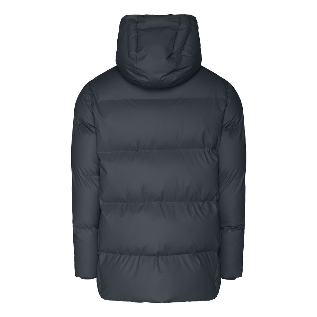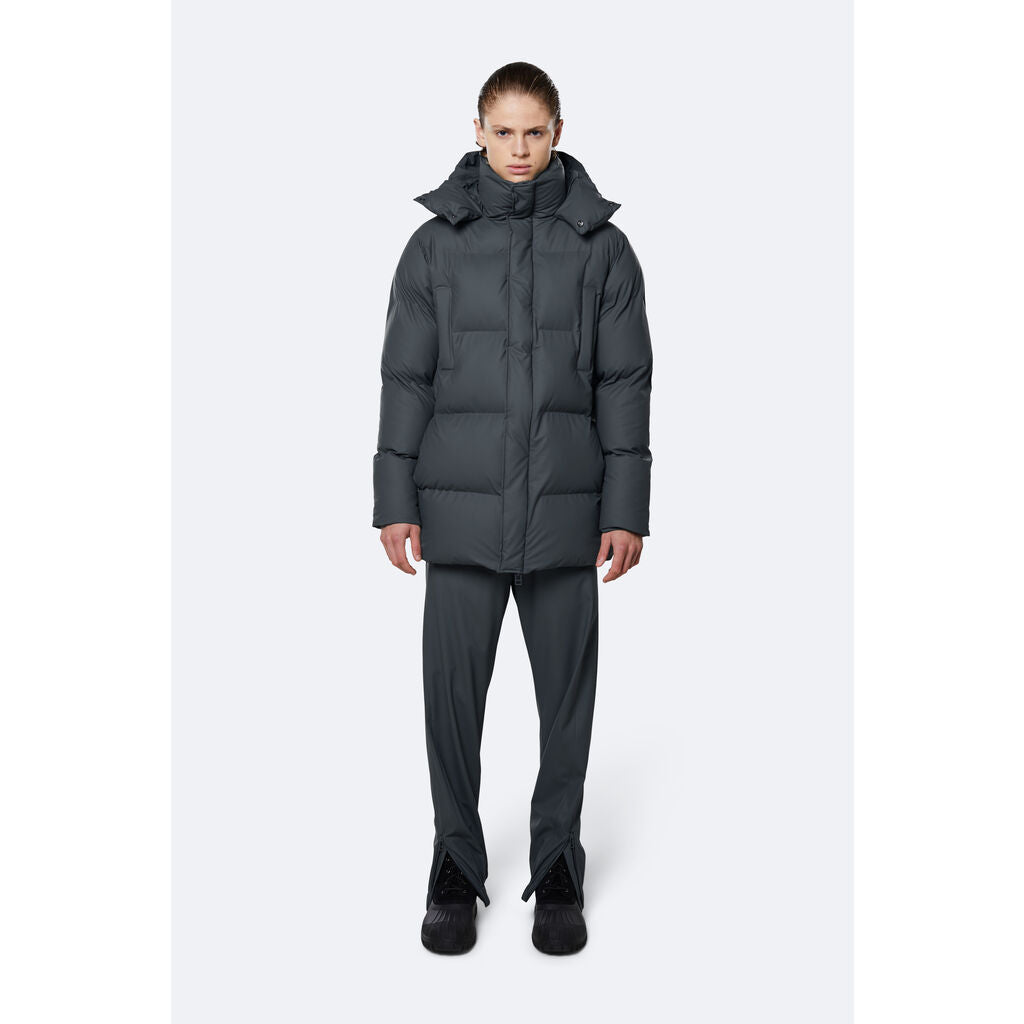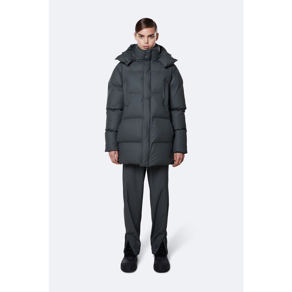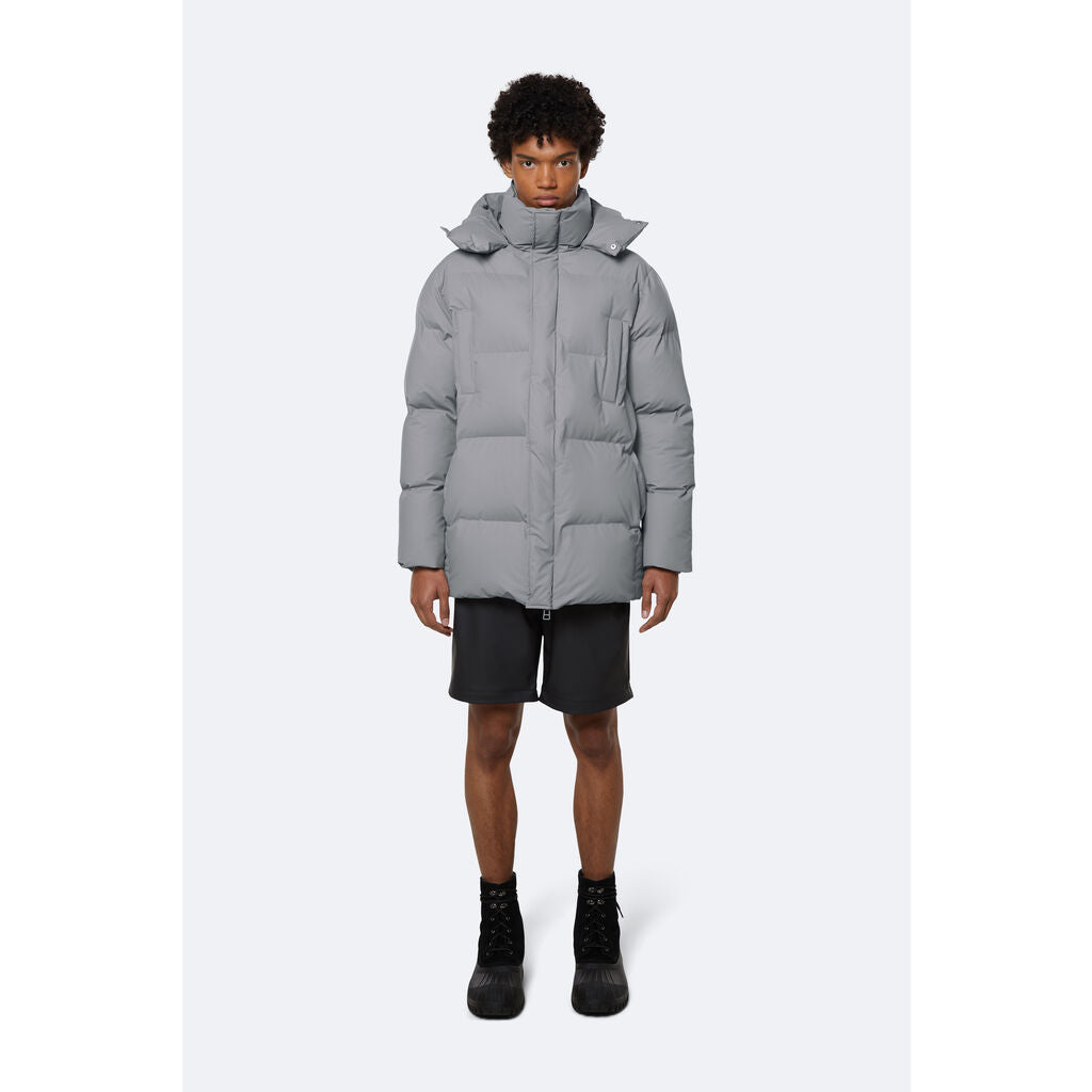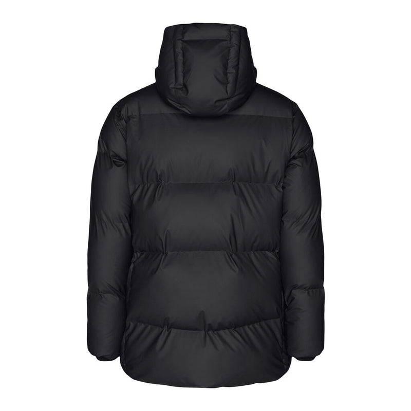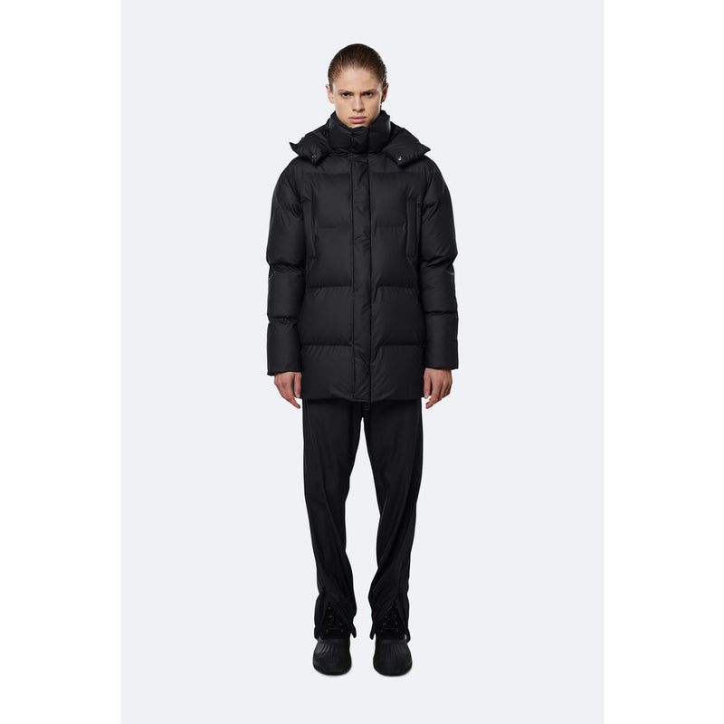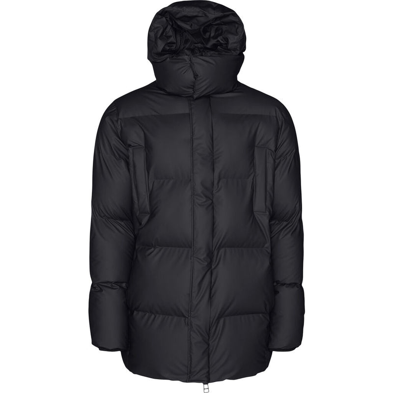 Hooded Puffer Coat is an insulated winter jacket from Rains Thermal category, constructed from a breathable, yet waterproof PU fabric. Hooded Puffer Coat is designed with a straight silhouette and wide puffer chambers that are filled with a plant-based insulation. Rains puffers feature an innovative approach to quilting via seamless chambers, woven from the backside to ensure a waterproof bond. Signature to Hooded Puffer Coat from Rains is a double collar effect, with the pairing of an insulated stand-up collar and an insulated hood. Lined in fleece, pockets are placed at the sides of the body, as well as at the chest.