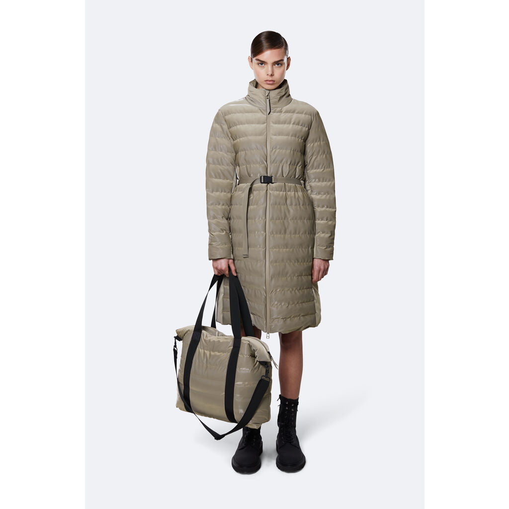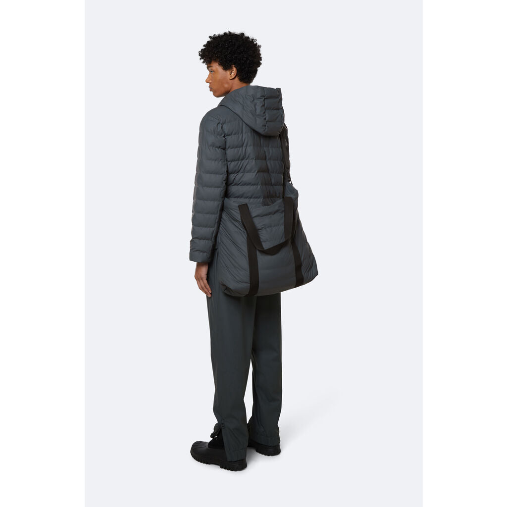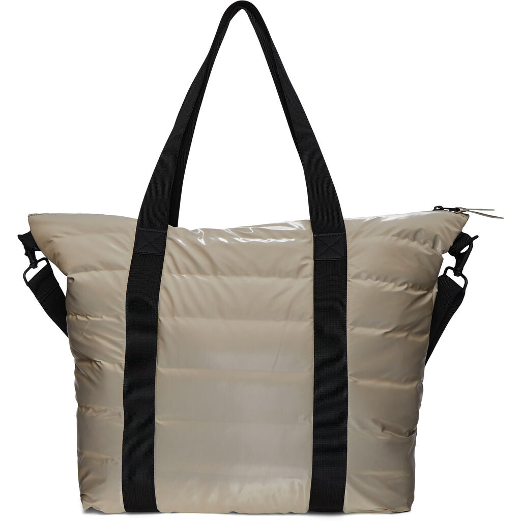 Constructed from soft, waterproof PU, this is a lightly padded and horizontally quilted version of the classic Rains Tote Bag. The bag is fully lined and has one main compartment with a practical inner pocket. It comes with two external webbing carry handles, a detachable crossbody shoulder strap, and a waterproof zipper to keep the contents dry.