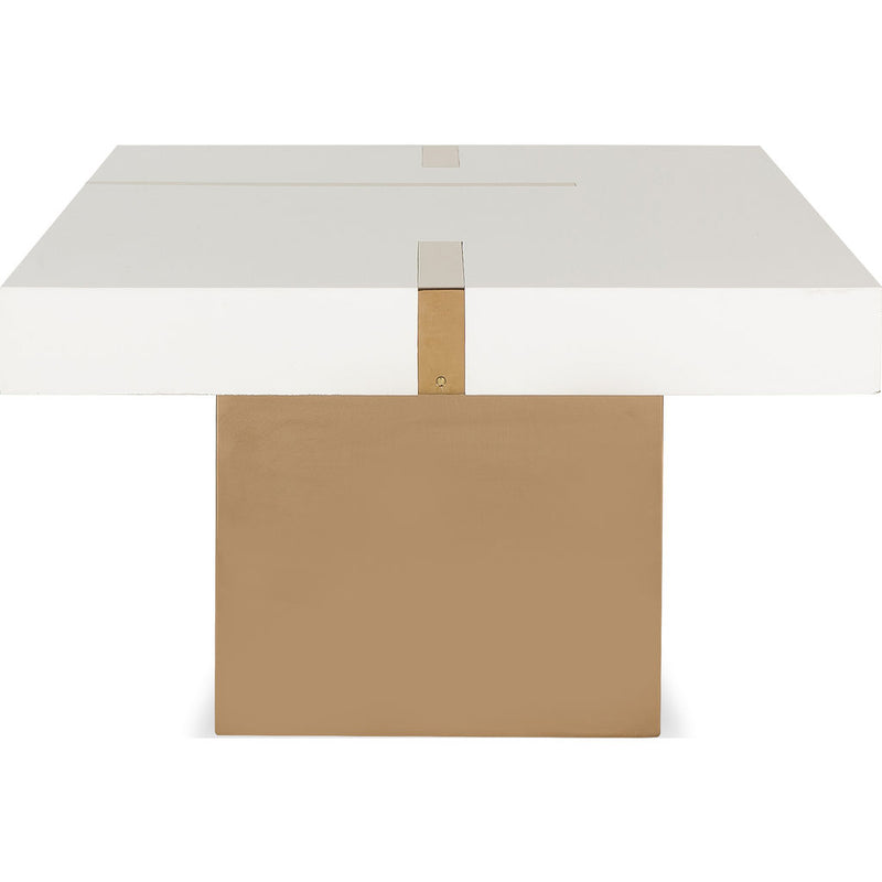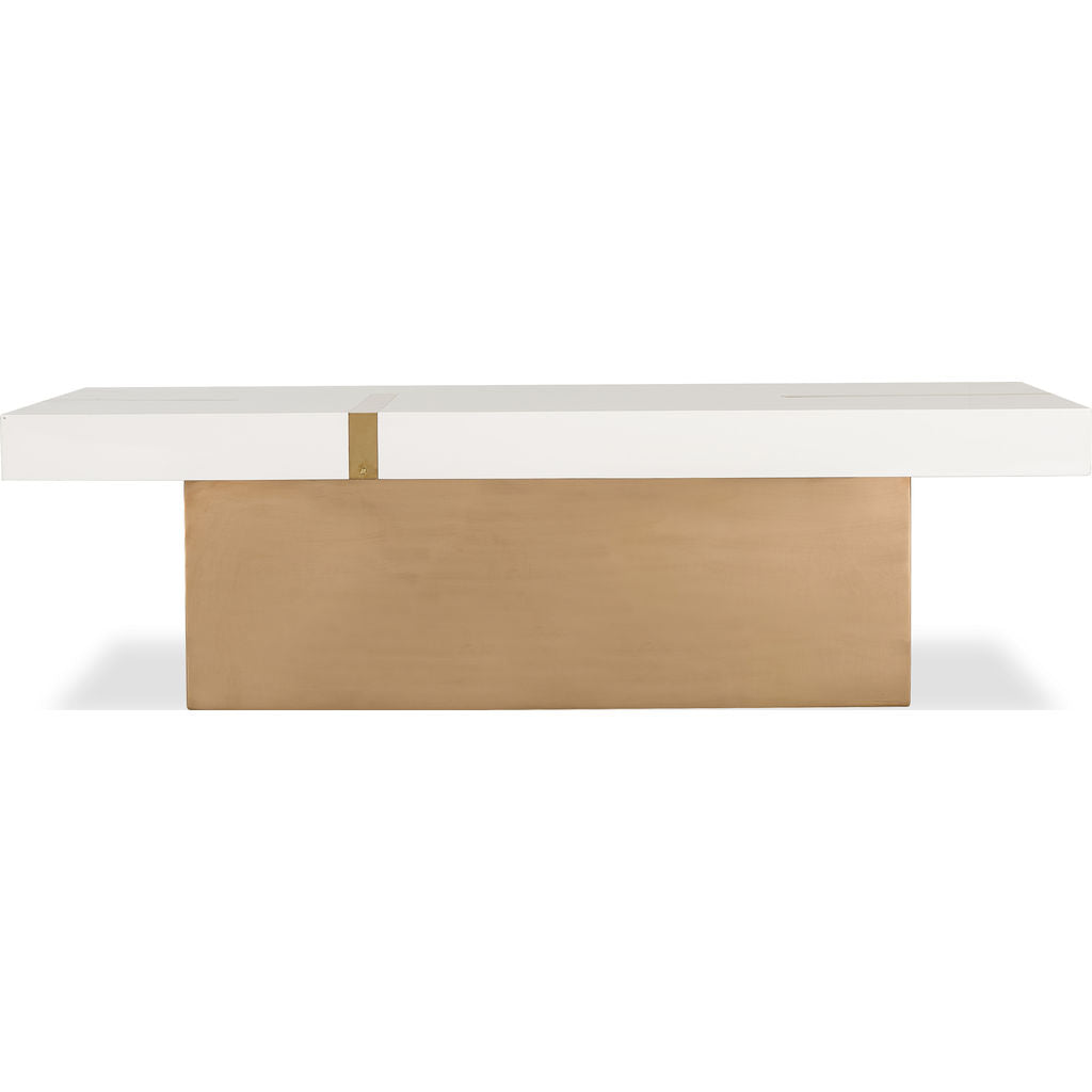 A contemporary center piece for the modern home, the Band Coffee Table from Resource Decor strikes a perfect balance of bold forms and differing materials. Contrasting a stainless steel plinth base that has been finished in mirrored brass and a snow white lacquered table top, the Band's unique geometric character creates undeniable visual interest.