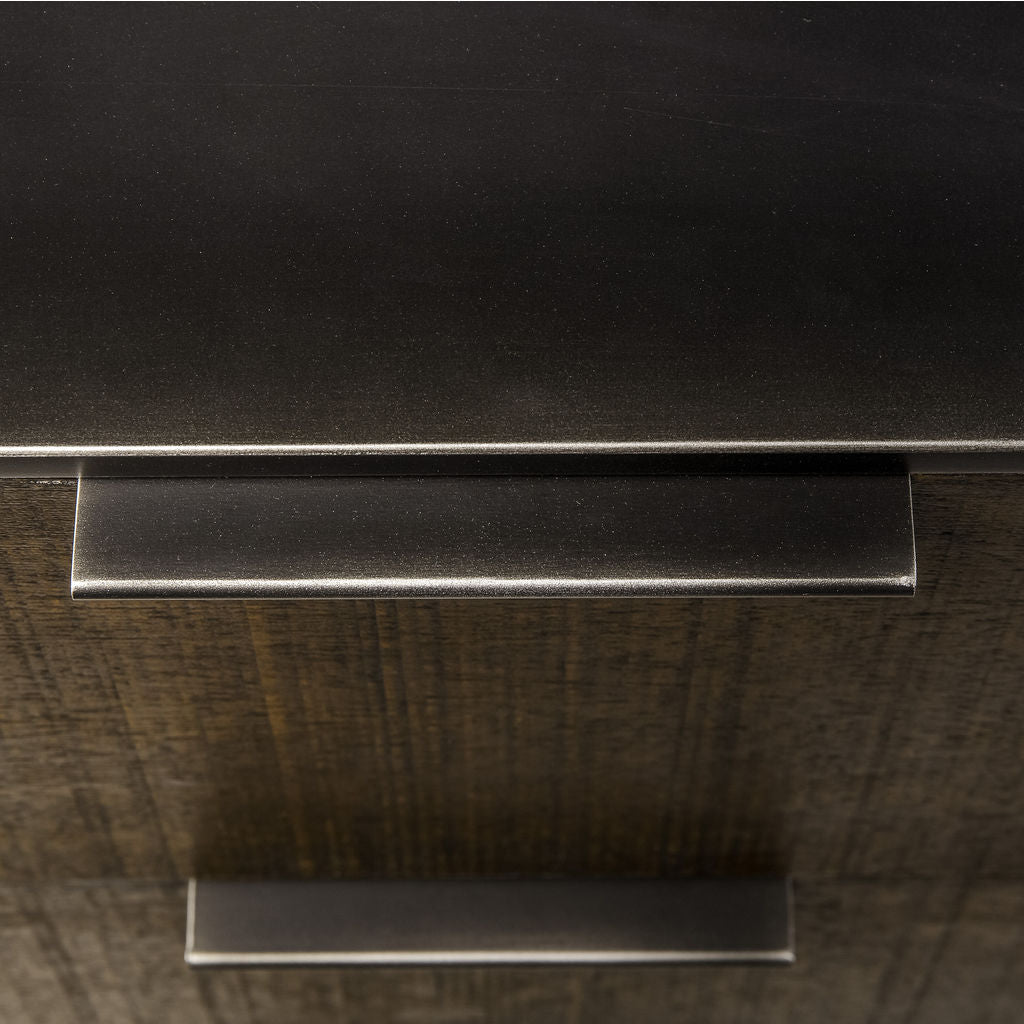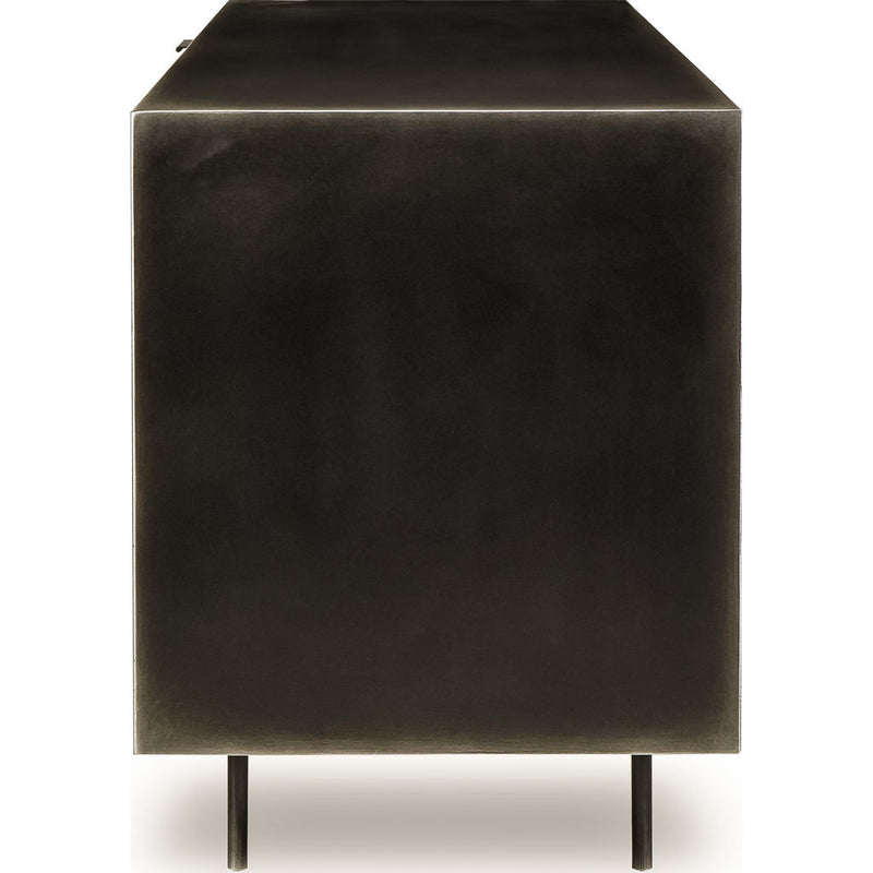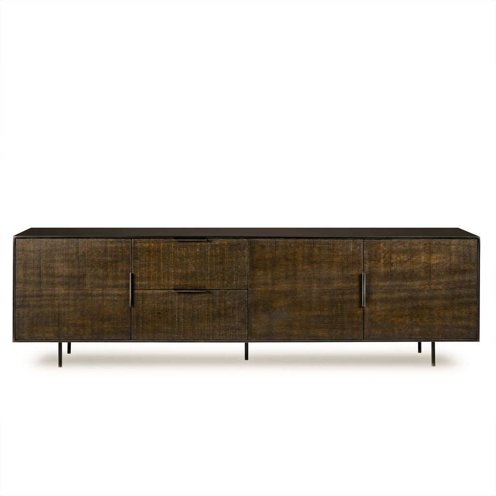 The Tribeca Media Console from designer Thomas Bina is crafted using a cold-rolled steel frame in an ebonized black coloration. Crafted with multiple cabinets and drawers, this storage unit showcases the natural grain of Brazilian Walnut wood.