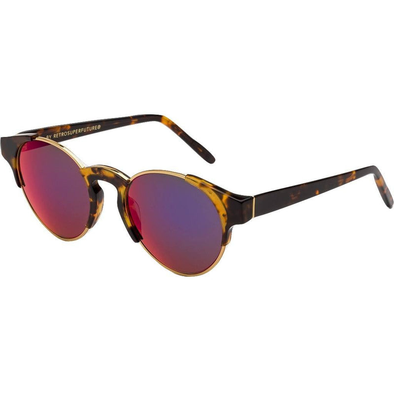 The Arca Sunglasses in Infrared by RetroSuperFuture feature a round, tortoise shell acetate frame, with gold-toned metal accents. Handcrafted in Italy with blue and pink reflective lenses, these glasses are guaranteed to turn heads.