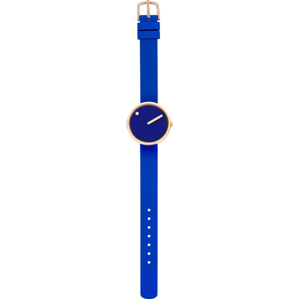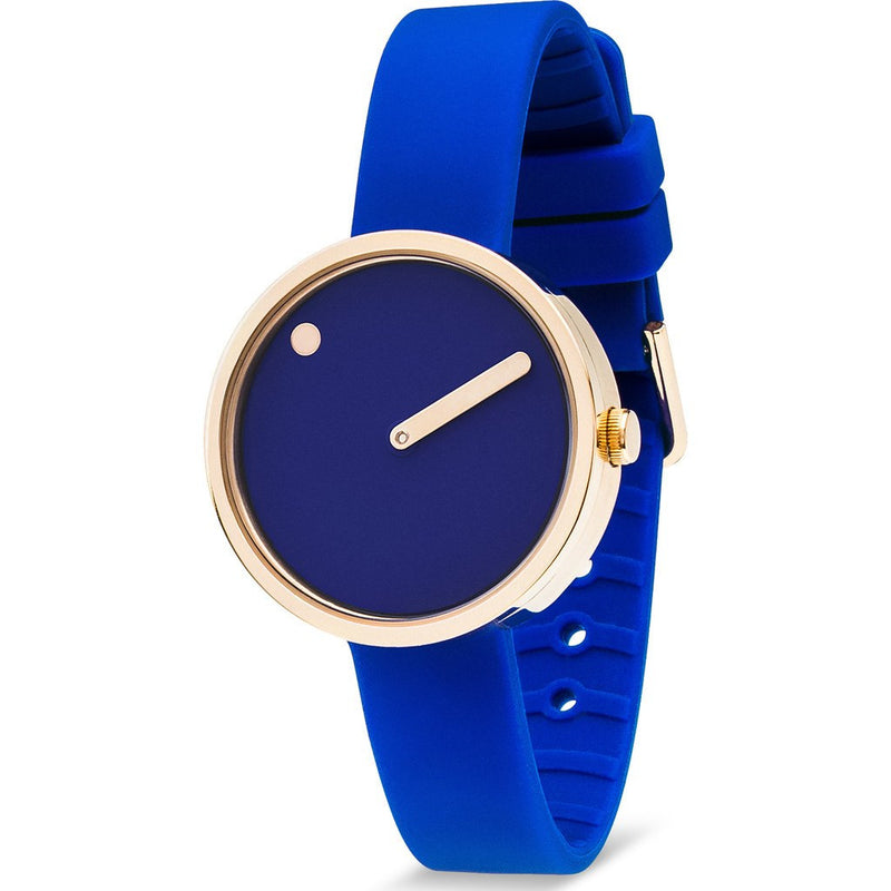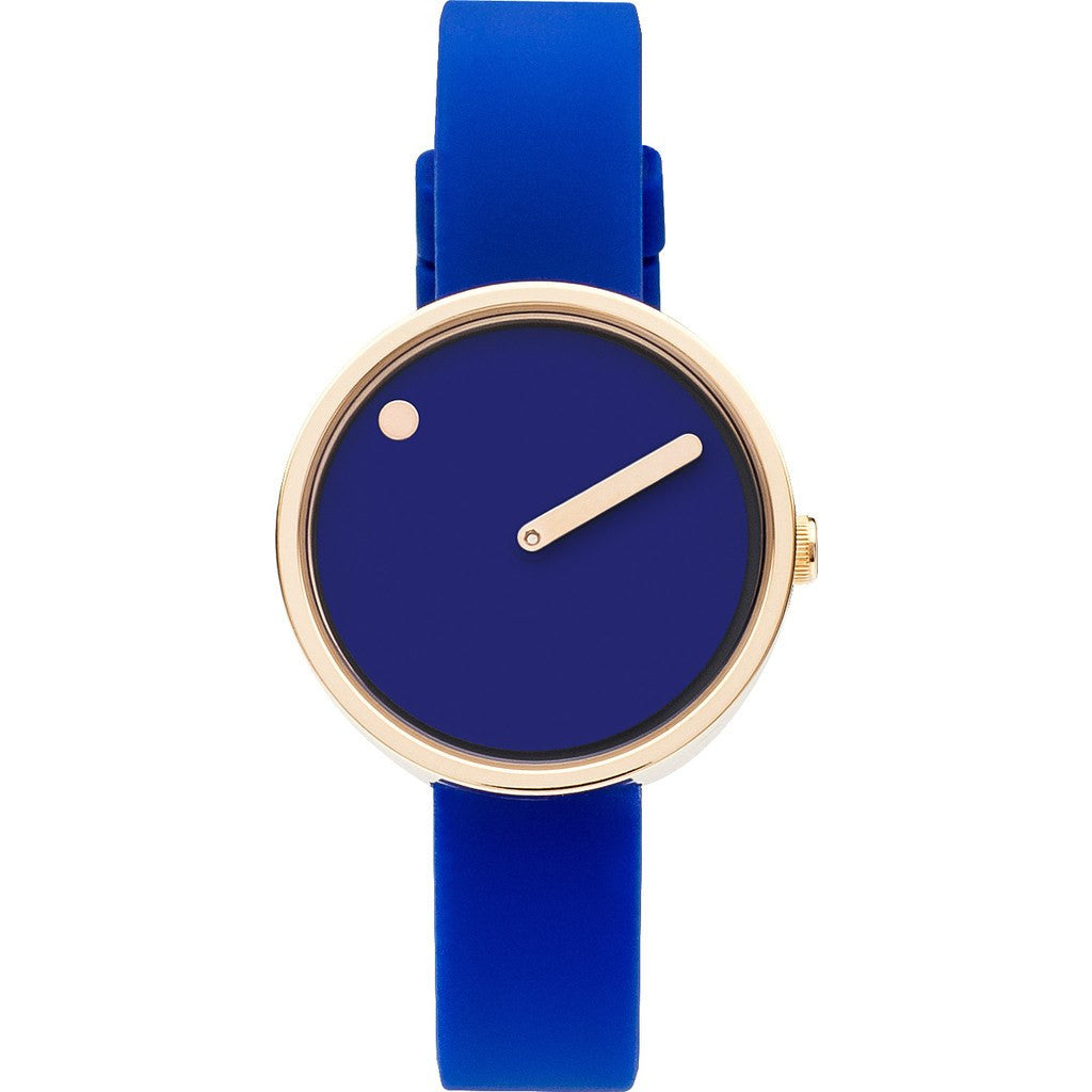 Steen Georg Christensen and his partner Erling Andersen had a vision to craft a watch that focuses on the minutes. The Rosendahl Picto 30mm Blue Analog Watch does just that. A true piece of art, this watch displays the hour with a dot on a rotating dial while the prominent minute hand ensures precise time-telling. Constructed with mineral crystal, this watch is designed with a blue dial, a rose gold coated steel case, a rose gold hand and is finished with a blue silicone band.