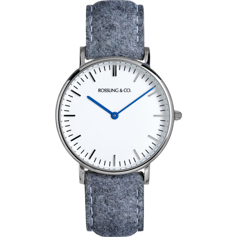 Rossling & Co. strives to craft quality watches that are both stylish and versatile. The Classic 36mm Stirling Watch is constructed with a slim case, Swiss quartz movement and is finished with a leather backed tweed strap. The sleek white dial is housed in a silver case. Whether you dress it up or down, this watch is perfect for any occasion.