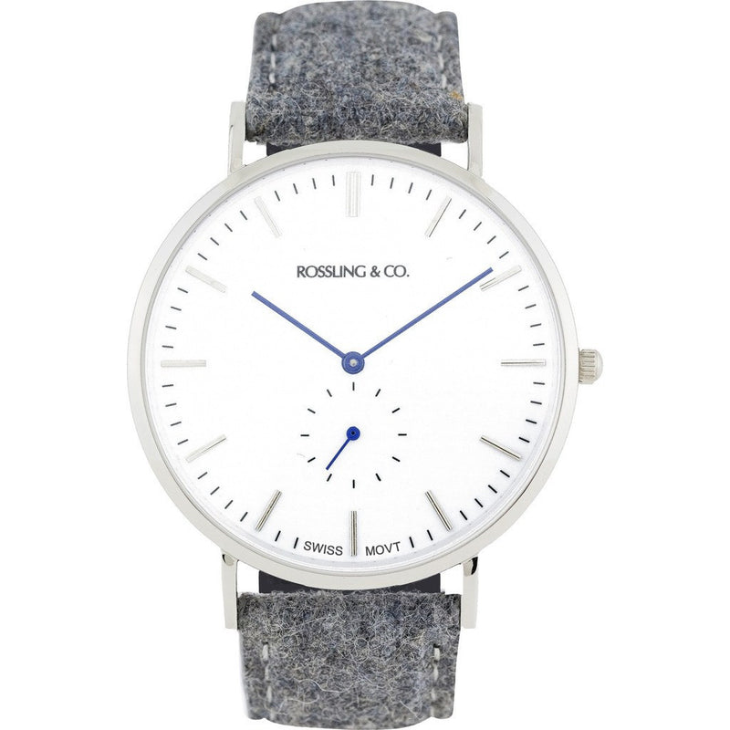 Rossling & Co. strives to craft quality watches that are both stylish and versatile. The Classic 40mm Stirling Watch is constructed with a slim case, Swiss quartz movement and is finished with a leather backed tweed strap. The sleek white dial is housed in a silver case. Whether you dress it up or down, this watch is perfect for any occasion.