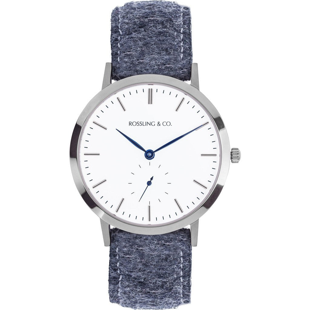 Rossling & Co. strives to craft quality watches that are both stylish and versatile. The Modern 36mm Glencoe Watch is constructed with a slim case, Swiss quartz movement and is finished with a leather backed tweed strap. The sleek white dial is housed in a silver case. Whether you dress it up or down, this watch is perfect for any occasion.