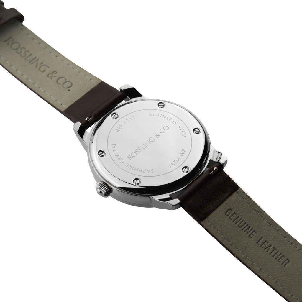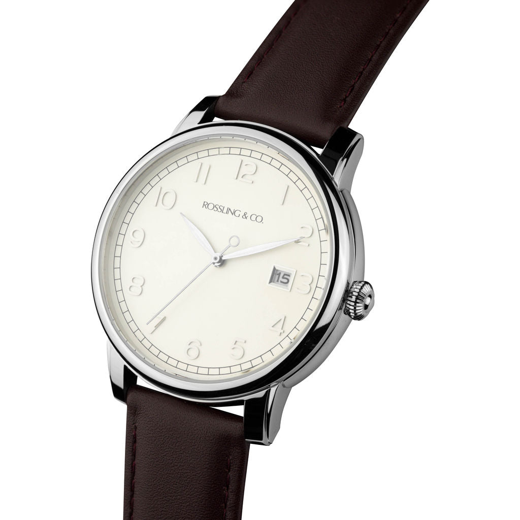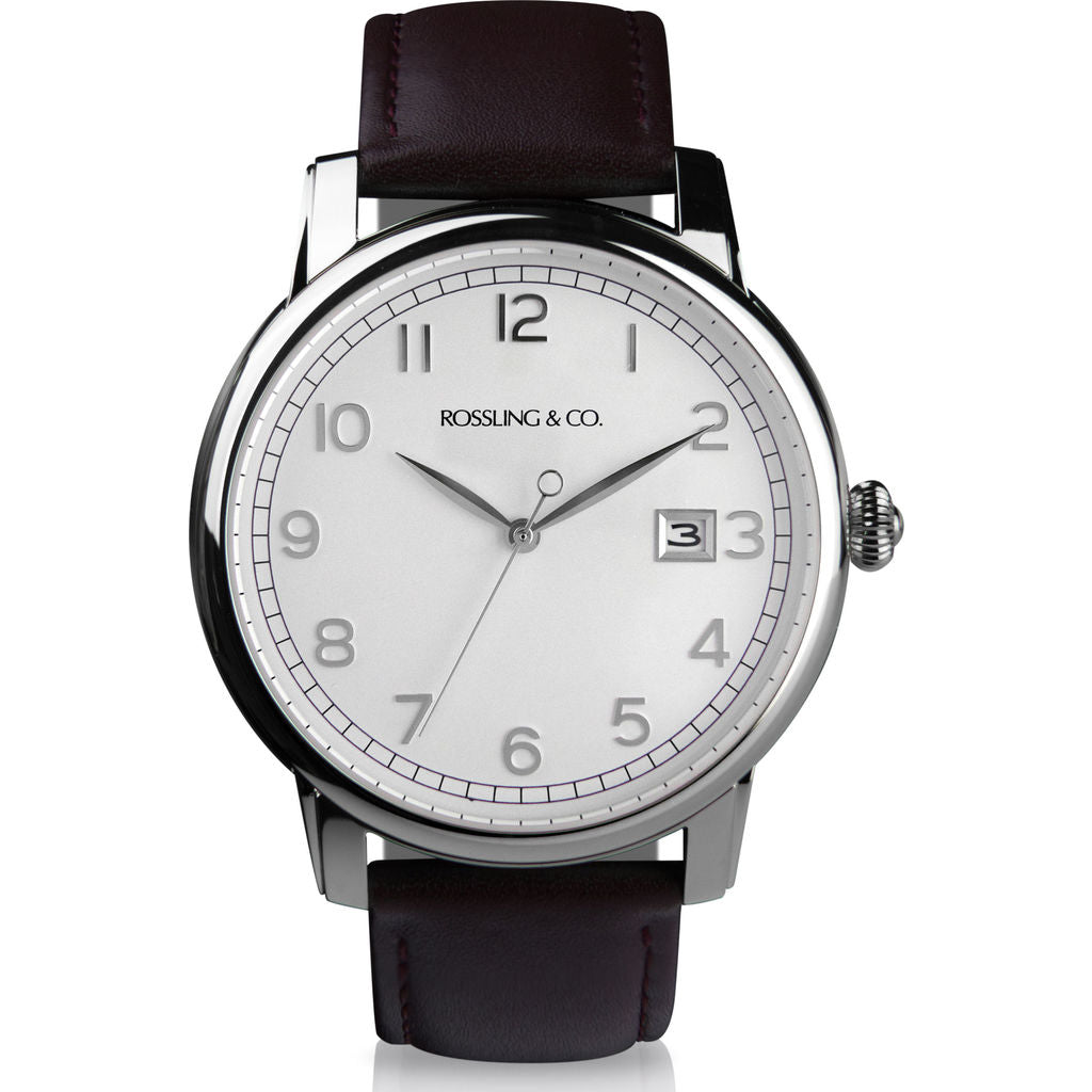 The Silver Opera Watch from Rossling & Co. has a 42mm dial. One of their most versatile watches, Rossling designed this watch to take you from day to night. This understated style is for those whose strength quietly speaks, those whose elegance gets discretely noticed. The numerals on the face are applied by hand, a celebration of classic European watchmaking. Featuring a white face and a black leather strap.