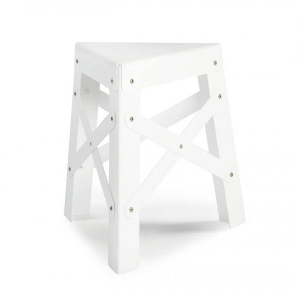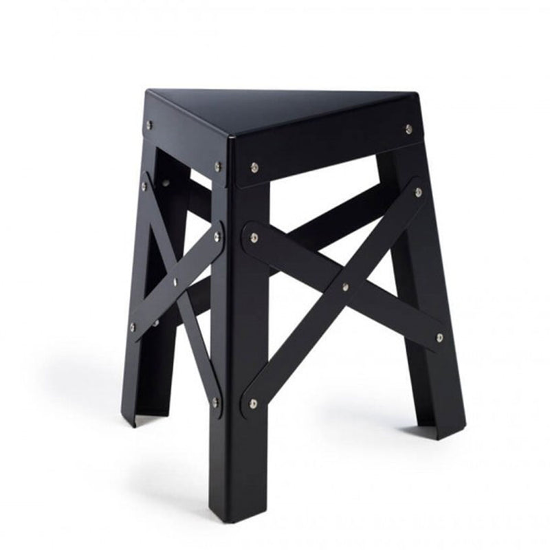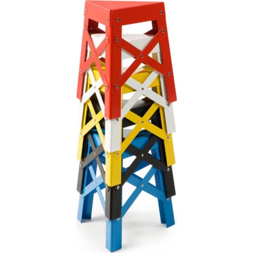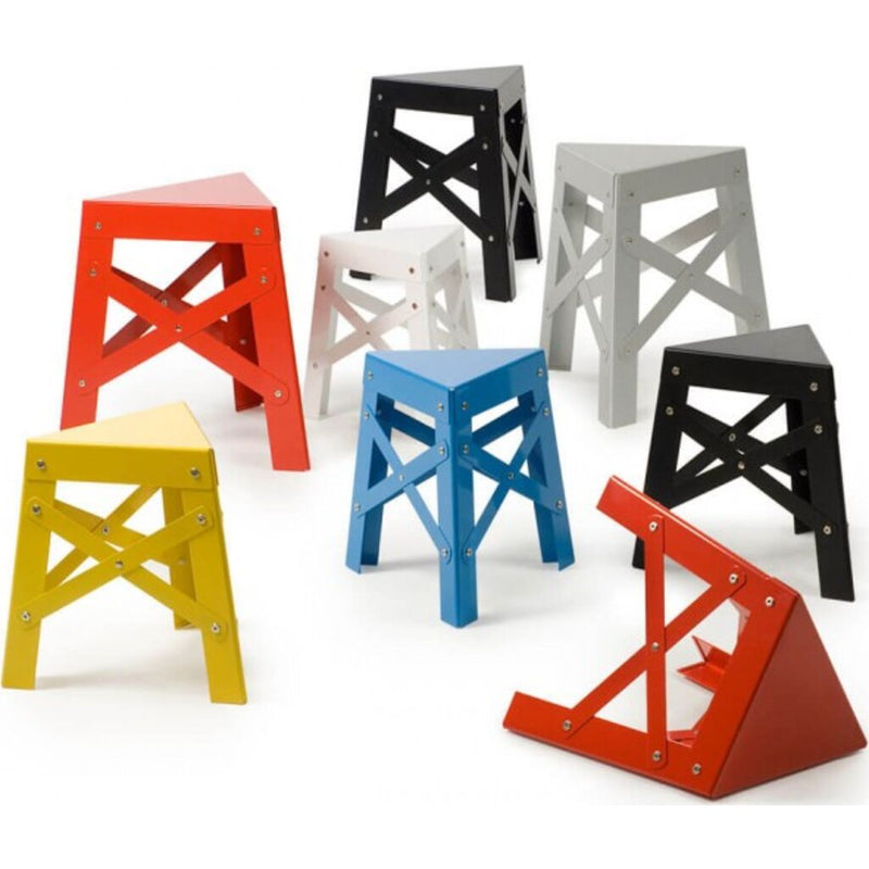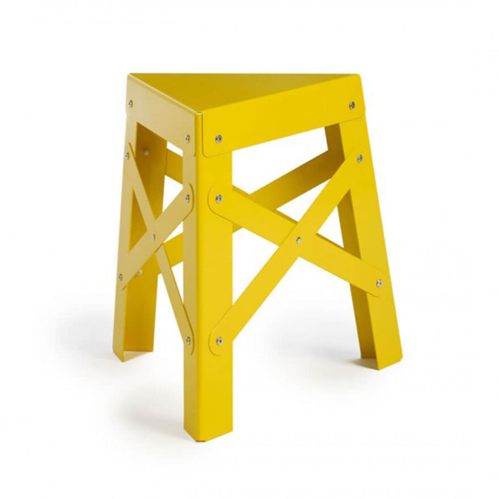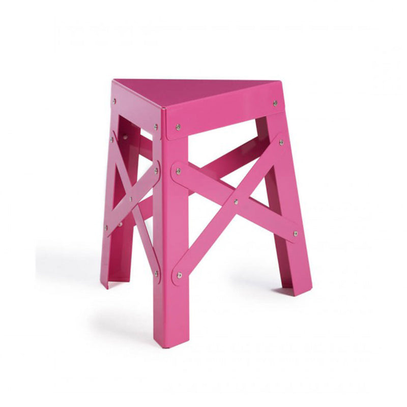 The Kid's Eiffel stool has been designed in a minimal manner so the structure itself becomes an artistic form. It's made out of aluminium so it's a stool that can be use both indoors and outdoors. It's stackable so it can be put away to one side of the room, taking up very little space. Built with 3 legs instead of 4. It's just a matter of ergonomics and comfort. The three legs offer the same stability as a four-legged stool and greater freedom of movement when you're sitting, because legroom is not limited by a chair-leg on each side.