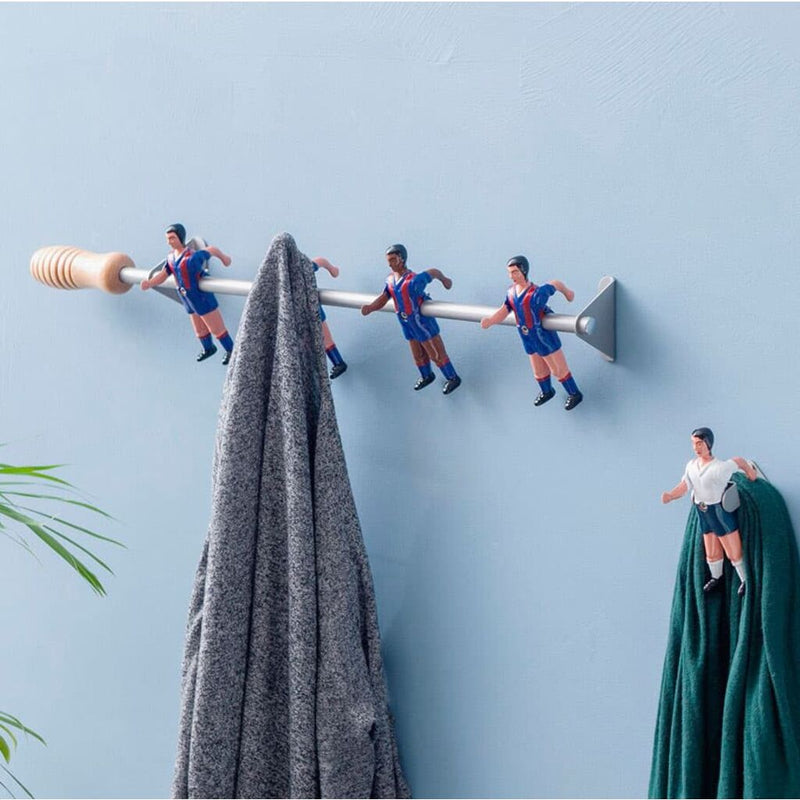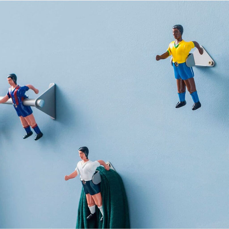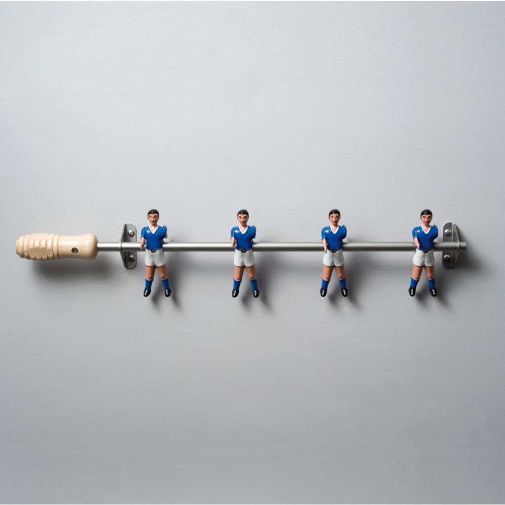 You can hang your jacket on the Wall Champions coat rack, but we designed it with the main function and goal of welcoming you home or seeing you out of the door with a smile. Wall Champions is a coat rack that was born a footballer. It’s an item that is as decorative as it is useful, with a friendly, sporty character. The players of the classic football table have walked off the pitch and onto a coat rack. Being able to take your team home, hang its colours on your wall and have your idols look after your jacket or bag is priceless if you’re a football fan. Wall Champions comes in two different models: the Wall Champions 4 – a rod with four players and a wooden handle that’s always visible – and the Wall Champions 1 – a single player with a wall fixture that’s hidden when you hang your jacket on it.
