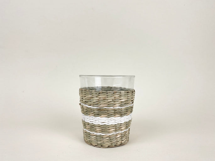 Wide tumbler glass. Removable seagrass wrapping. Charming size for a cocktail or dessert. Pairs well with the Indochine Pitcher (as shown in the second picture, Indochine Highball is also in the image).