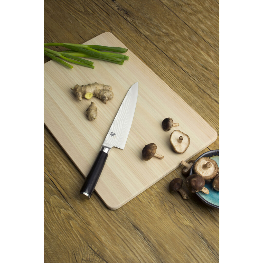 In Japan, this knife style is known as a gyuto. It is the Japanese equivalent of the chef’s knife. In other words, it’s an all-purpose knife. It’s ideal for meat and fish, yet performs beautifully on vegetables, too. Although the blade profile is narrower than the traditional chef’s knife, it still offers plenty of knuckle clearance when cutting on a board. If you’re looking for a lighter, more nimble multi-purpose kitchen knife, the Shun Classic Asian Cook’s Knife is sure to become your go-to knife for a wide range of food preparation tasks. The Shun Classic 7-in. Asian Cook’s Knife is part of the Shun Classic line of tasteful and contemporary cutlery. The Shun Classic line features beautiful Damascus-clad blades and D-shaped ebony PakkaWood handles. Yet behind these handcrafted knives' beauty is function: razor-sharp blades offering top performance. Shun's proprietary high-performance VG-MAX steel, which provides incredible edge retention, is clad with Damascus stainless steel, then ground and bead-blasted, revealing the flowing pattern of the layered steel. The result is a line of knives that are sharp, durable, and corrosion resistant, as well as beautiful to behold. The Shun Classic line also offers you the widest assortment of both traditional culinary blade shapes and cutting-edge designs, so you can always find the right knife for the task.