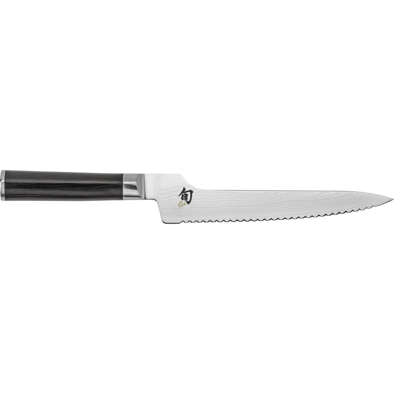 Have you ever found yourself hovering over the edge of the cutting board so that you don't knock your knuckles on the board as you reach the bottom of the stroke? The Shun Offset Bread Knife solves the problem. The offset handle position creates additional knuckle clearance and perfectly positions your hand for a more powerful—and thus, easier—cut. The scalloped serrations will slice neatly into your loaf without skidding; no matter how crusty it is. You'll also enjoy the way the knife glides through bread without shredding and with fewer crumbs.The Shun Classic Offset Bread knife works equally well on tender desserts such as angel food cake, enabling you to create beautiful, tear-free slices. The Shun Classic Offset Bread Knife is part of the Shun Classic line of tasteful and contemporary cutlery. The Shun Classic line features beautiful Damascus-clad blades and D-shaped ebony PakkaWood handles. Yet behind these handcrafted knives' beauty is function: razor-sharp blades offering top performance. Shun's proprietary high-performance VG-MAX steel, which provides incredible edge retention, is clad with Damascus stainless steel, then ground and bead-blasted, revealing the flowing pattern of the layered steel. The result is a line of knives that are sharp, durable, and corrosion resistant, as well as beautiful to behold. The Shun Classic line also offers you the widest assortment of both traditional culinary blade shapes and cutting-edge designs, so you can always find the right knife for the task.