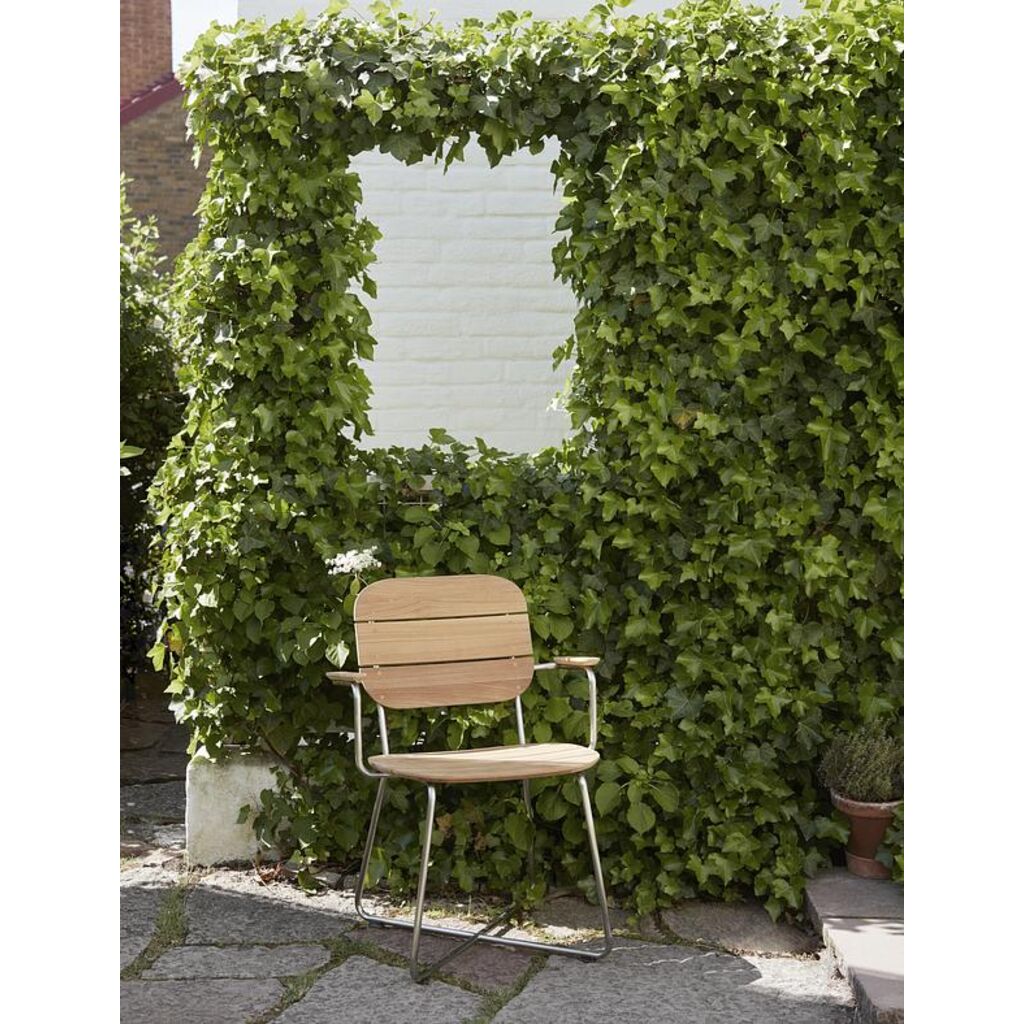 Lilium armchair has the characteristic crossing steel frame of the series that provides stability, while the gaps between the graphic teak slats on seat and back let the rainwater drain off. The small armrest offers a rest while seated, and the proportions of the chair make it easy to slide underneath the table.