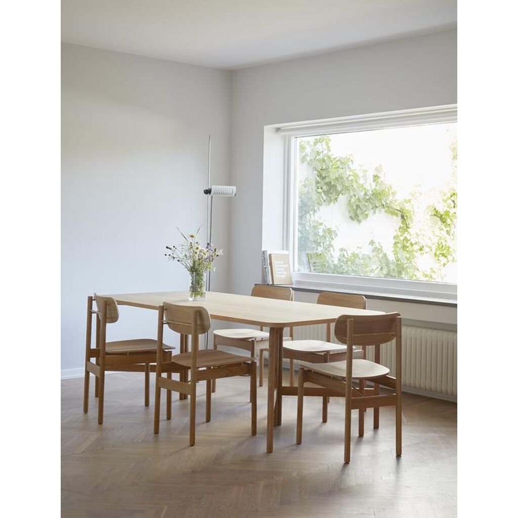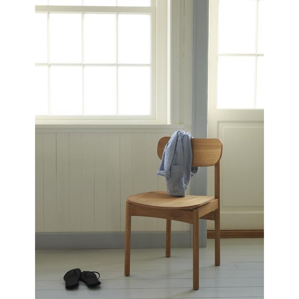A transverse brass rod indicates where you pull out the chair. Legs that continue up into the backrest and becomes a small hook, where you can hang your purse. A body in golden oiled oak that naturally contrasts the details in brass. A dining chair designed in a well-proportioned idiom, making it a comfortable seat. Vester Chair is elegant in a discreet way and understated without losing its momentum. Vester Chair is developed and produced by Skagerak for the seaside hotel, Svinkløv Badehotel.