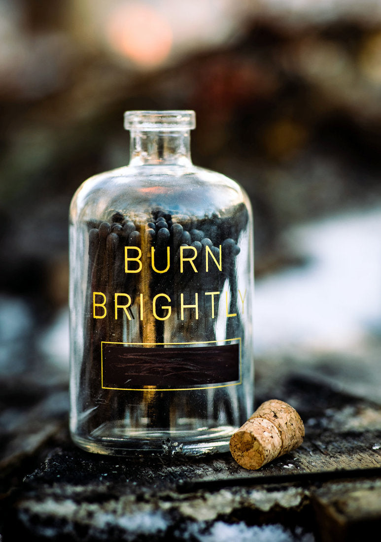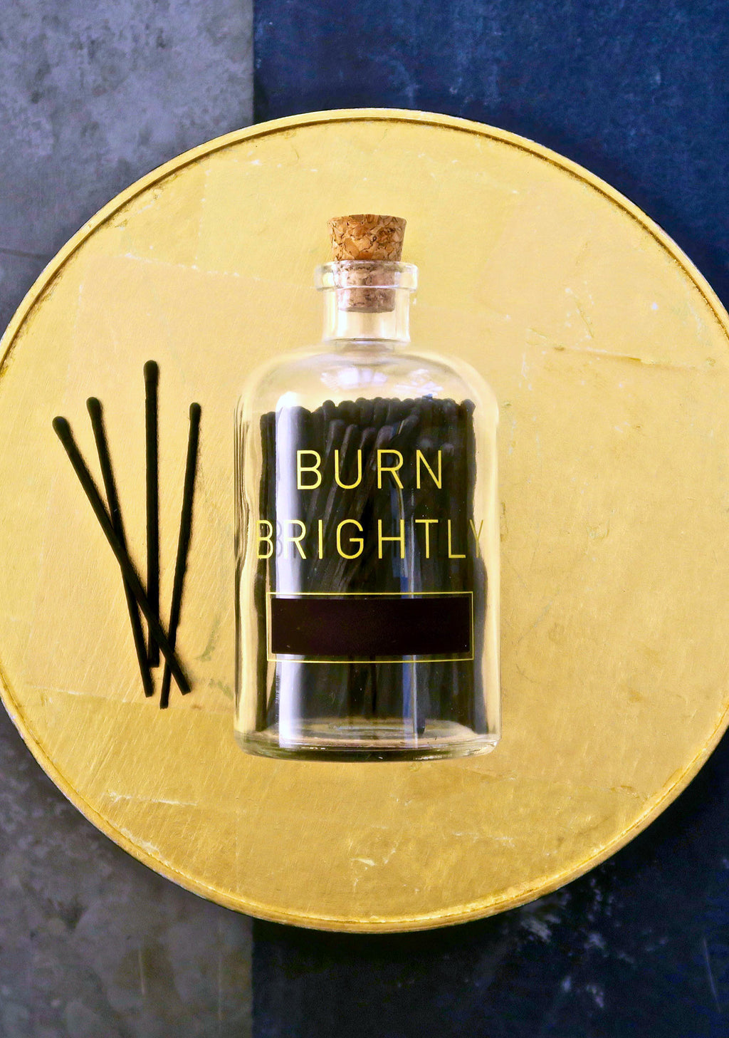 On dark winter days we could all use a little light. This match bottle features a matte gold “Burn Brightly” screen print against the backdrop of all-black matches. Let this sentiment motivate you every time you light a candle or fire up the fireplace, and remind you to live every day to the fullest.