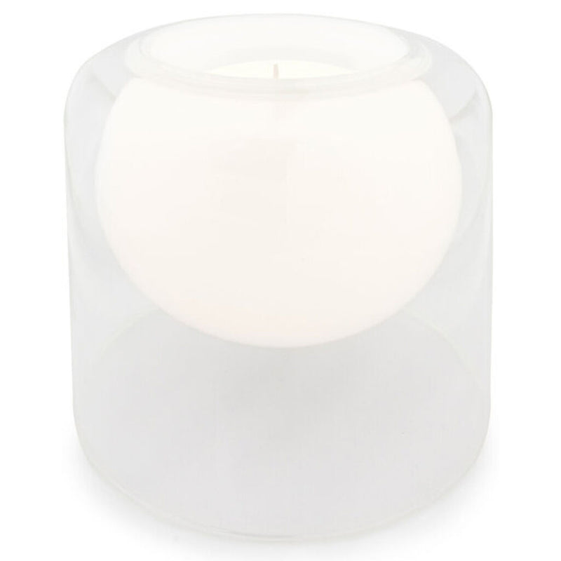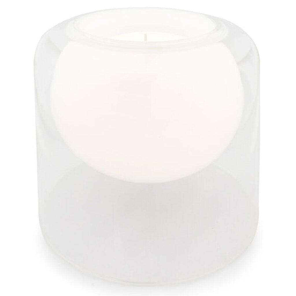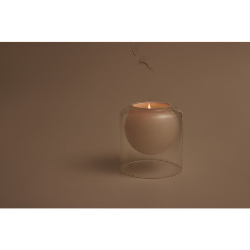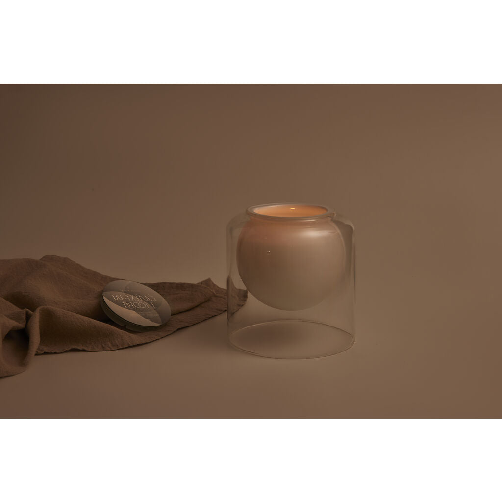 The outside is clear and inside is a suspended white sphere that illuminates with a warm, soft glow when lit. At 180 hours of burn time, it will burn through many moon cycles. Waxing Moon: A heady floral jasmine deepened with woodsy sandalwood and amber notes.