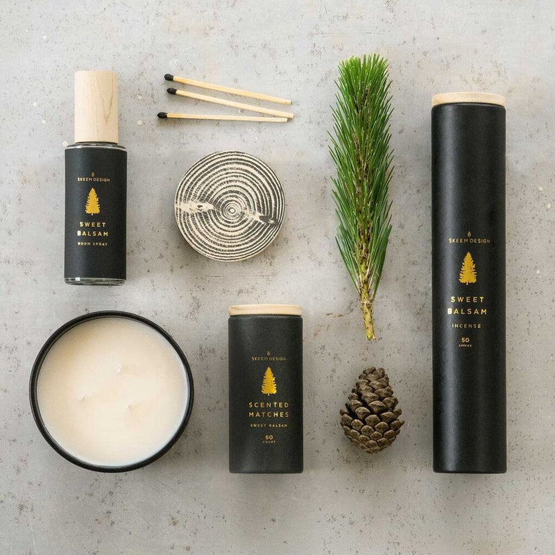 Sweet Balsam is a blend of evergreens highlighted by spring bulbs and pine cones. Contains all-natural cedarwood, grapefruit, pine, and patchouli oils. Our Sweet Balsam collection stylishly brings the outdoors inside. Candles, incense, and matches are all scented with our classic Sweet Balsam exclusive scent, a blend of evergreens highlighted with top notes of spring bulbs and pinecones.