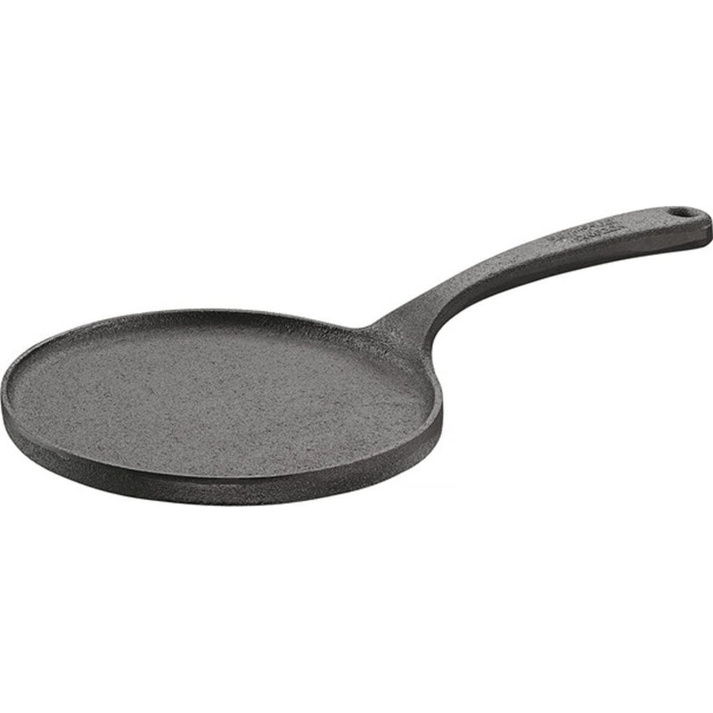 Cast iron handle. 0.20” thick bottom gives even heat conduction and an outstanding searing surface. Sits stable on the stove-top even at hot temperatures thanks to the precision-milled concave bottom. Hand-ground edges around the pan. Cast iron lip acts as a support handle. Works on all types of stove-tops, including induction and gas. Natural non-stick surface made of seasoned organic canola oil.