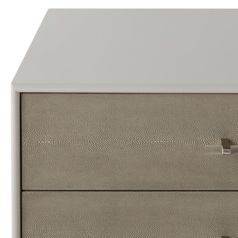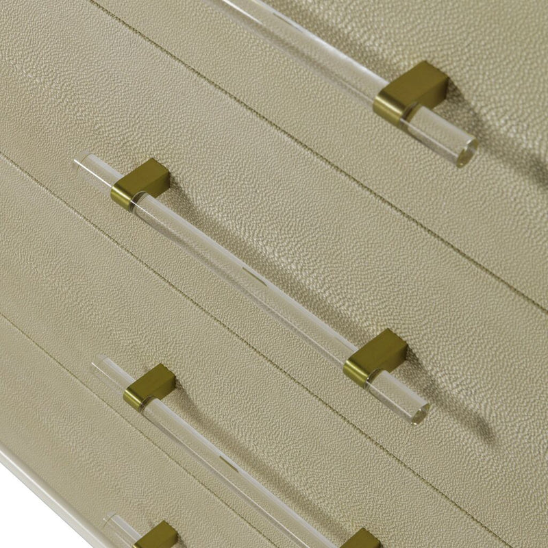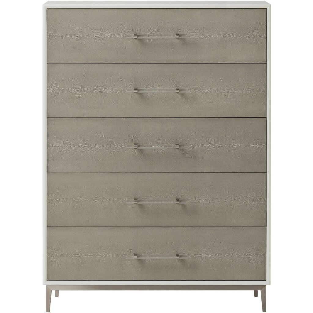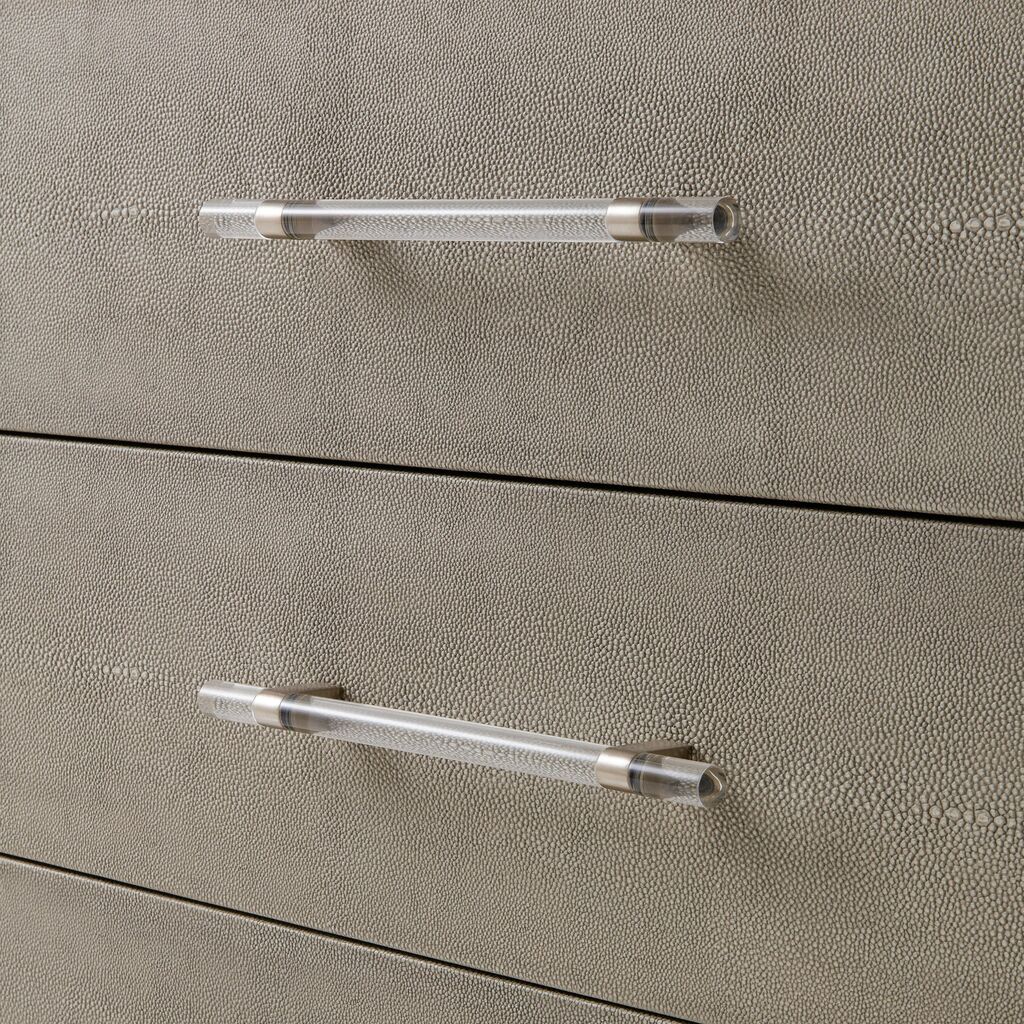 Stylishly formed; this classic five-drawer chest is a versatile piece for both contemporary and traditional interiors. The elegant metal frame contrasts perfectly with luxurious faux shagreen drawer fronts. Solid perspex handles completes its look giving it an extra chic touch. Due to the nature of shagreen, the coloring may vary from one piece to another, these differences add to the natural beauty of the product. The color may also vary with time.