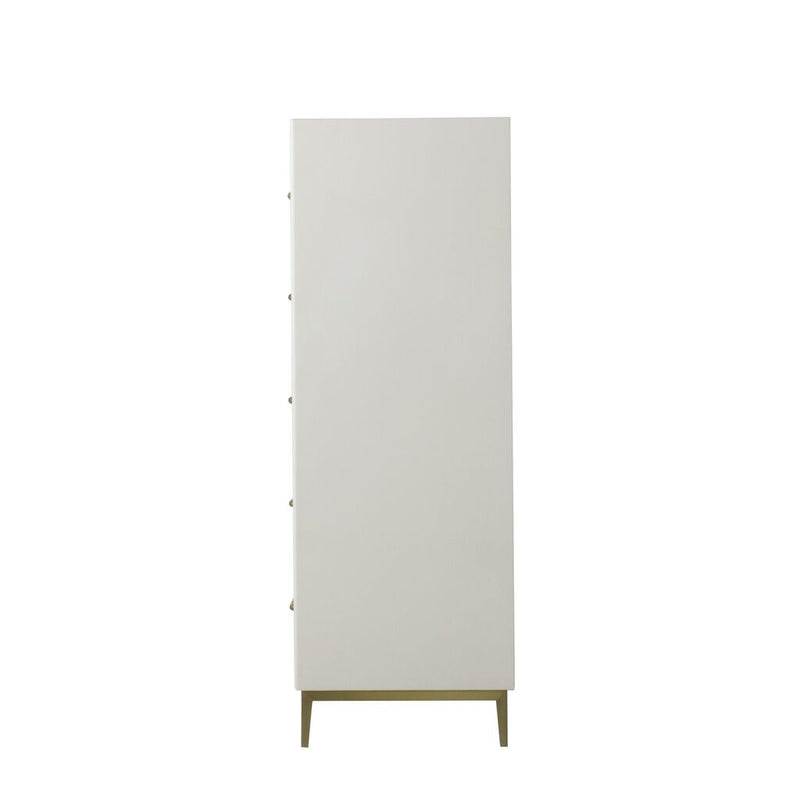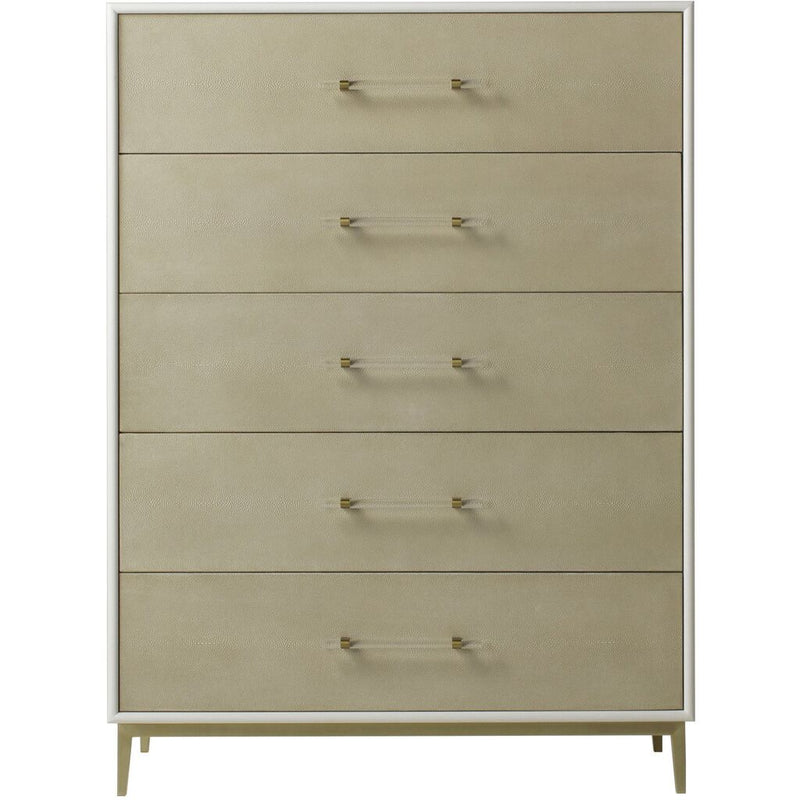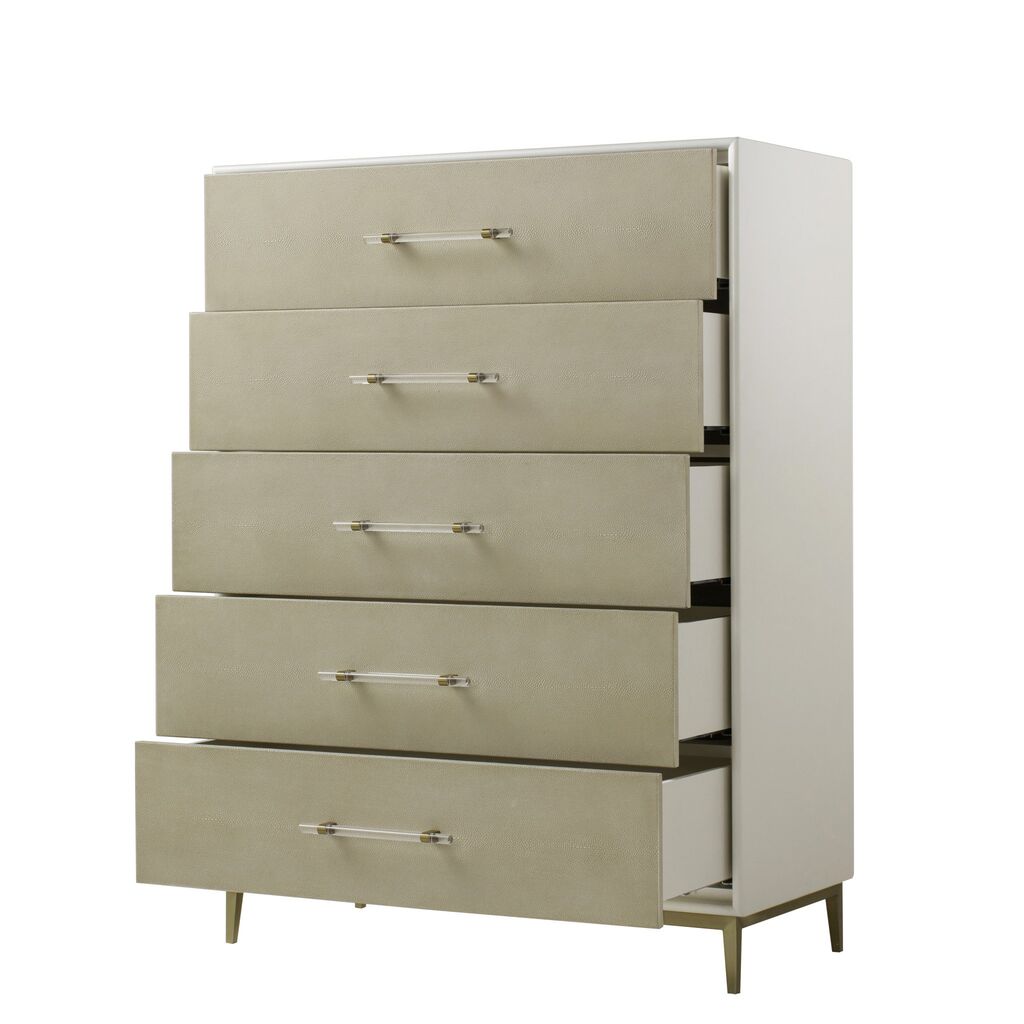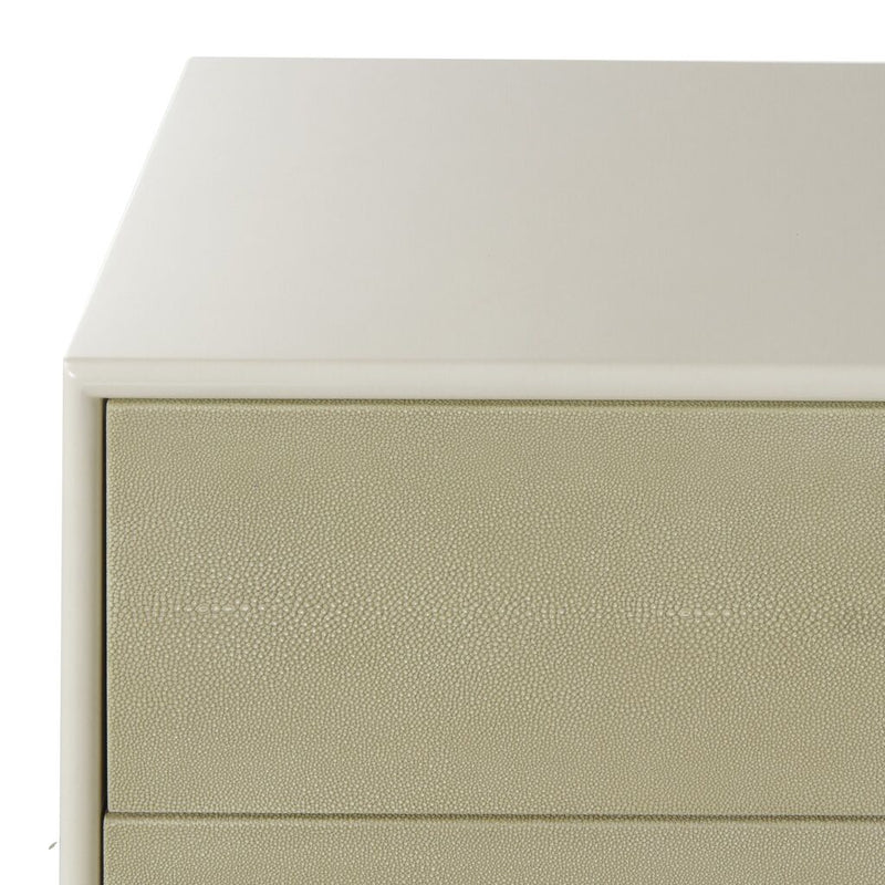 Stylishly formed; this classic five-drawer chest is a versatile piece for both contemporary and traditional interiors. The elegant metal frame contrasts perfectly with luxurious faux shagreen drawer fronts. Solid perspex handles completes its look giving it an extra chic touch. Due to the nature of shagreen, the coloring may vary from one piece to another, these differences add to the natural beauty of the product. The color may also vary with time.