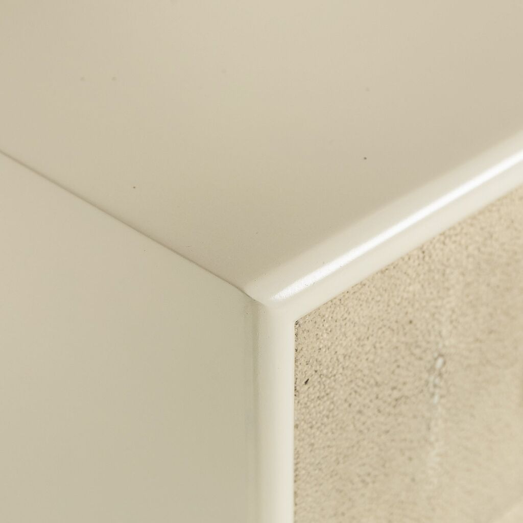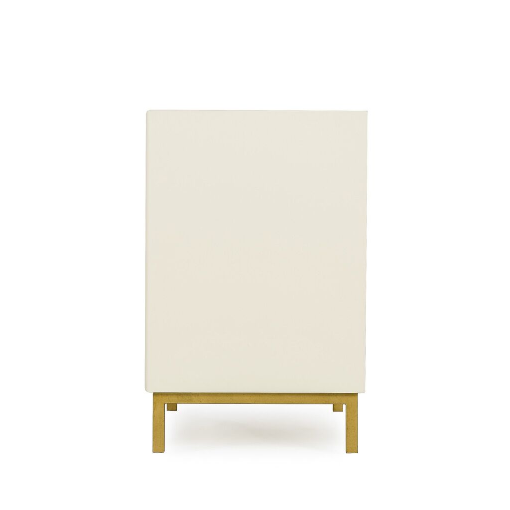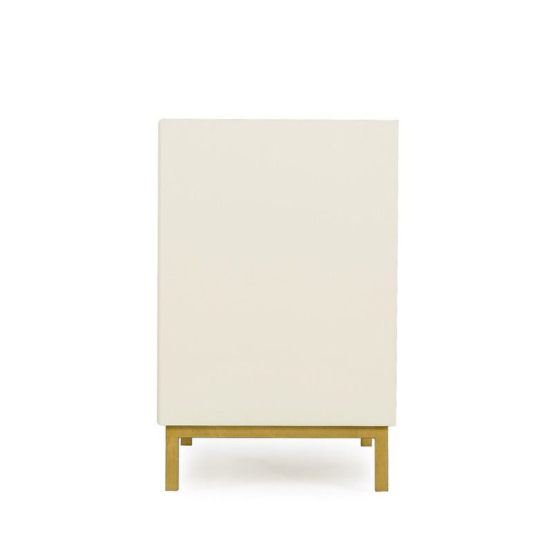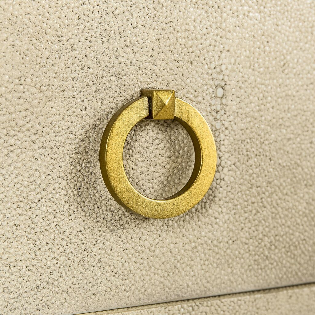 This classic nightstand is a versatile piece for contemporary and traditional interiors. An elegant satin brass-finished iron frame is finished in sleek, cream lacquer, which contrasts perfectly with textured, taupe faux shagreen drawer fronts. The piece also features satin brass decorative handles on each of the three drawers. Due to the nature of shagreen, the coloring may vary from one piece to another, these differences add to the natural beauty of the product. The color may also vary with time.
