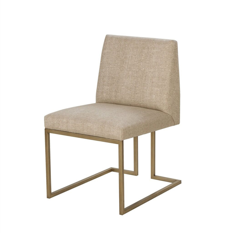This chair epitomizes simplicity and elegance; a slim, graphic metal frame crafted from stainless steel in a warm brass finish feed seamlessly into a fully upholstered seat and back, shown here in Sunbrella fabric, Marley Hemp.