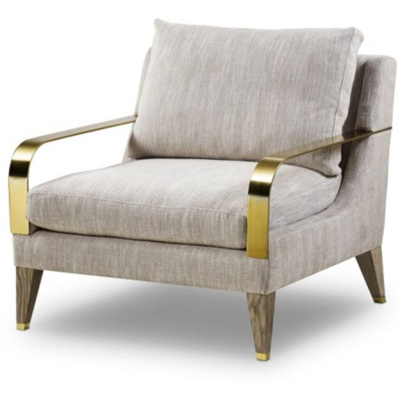 A modern interpretation of a classic lounge chair, Bartholemew's stainless steel arms with mirrored brass finish and matching leg caps contrast beautifully with solid oak legs, while a gentle wire brushed finish stained in a soft gray oak hue adds softness.