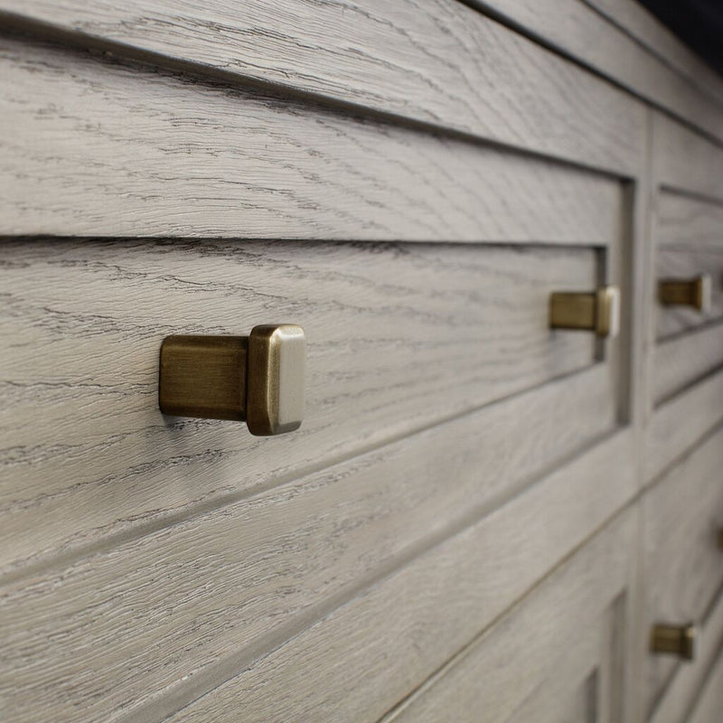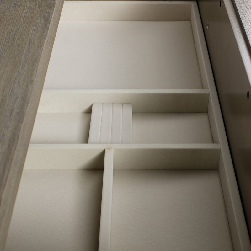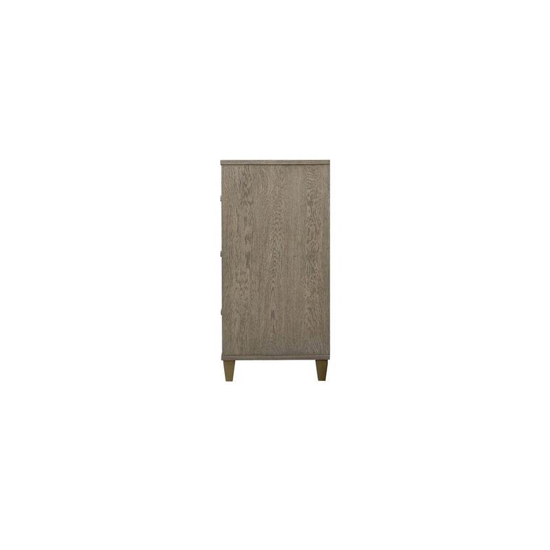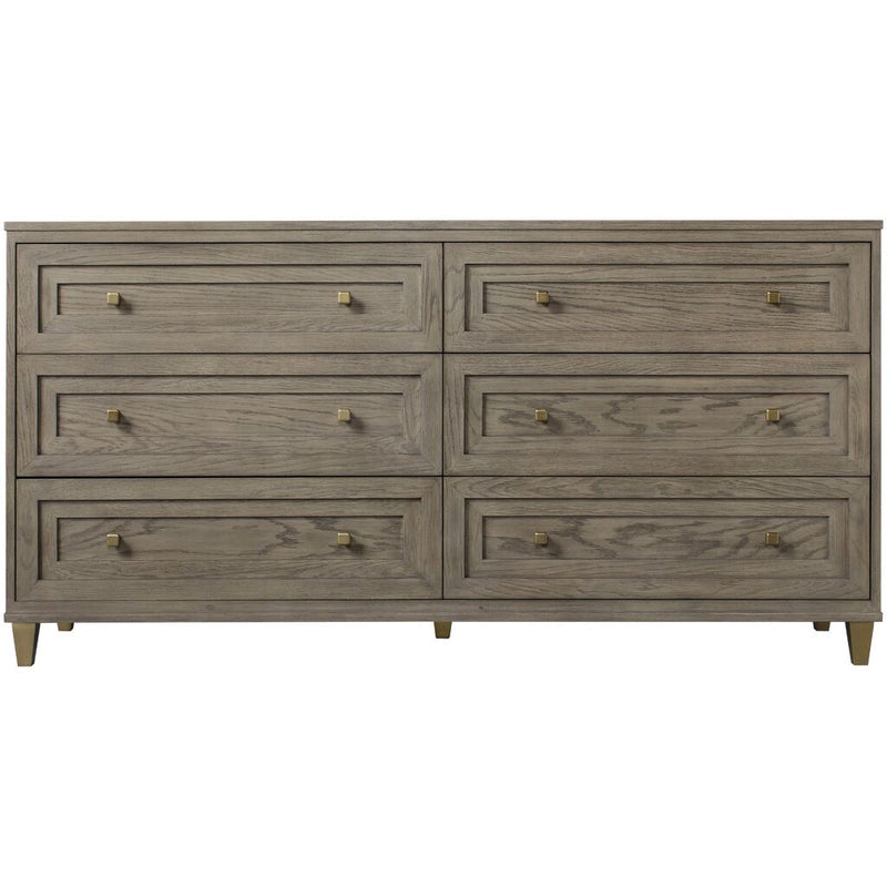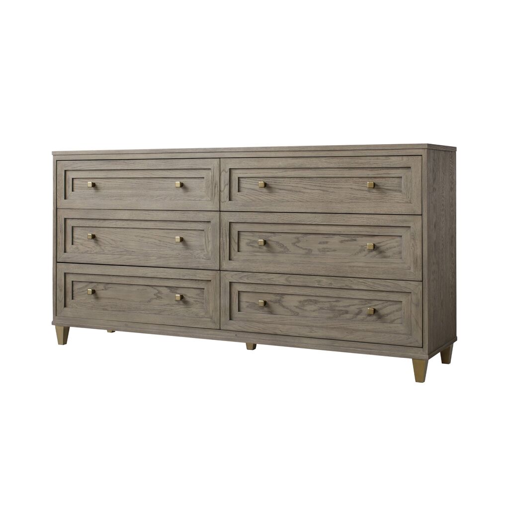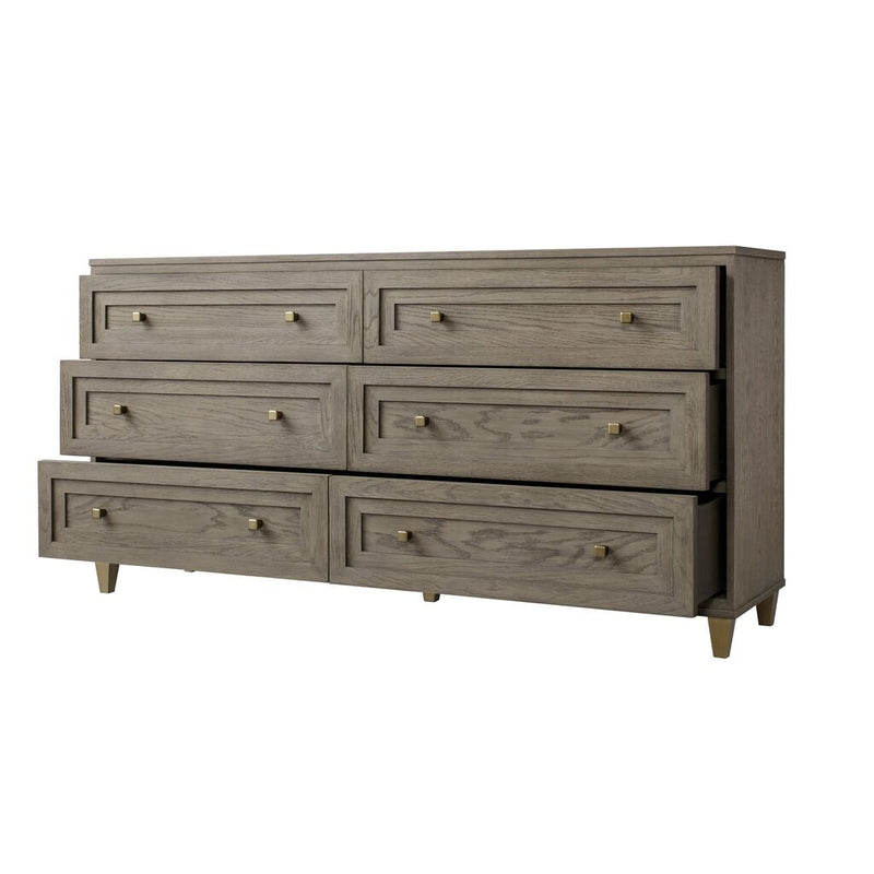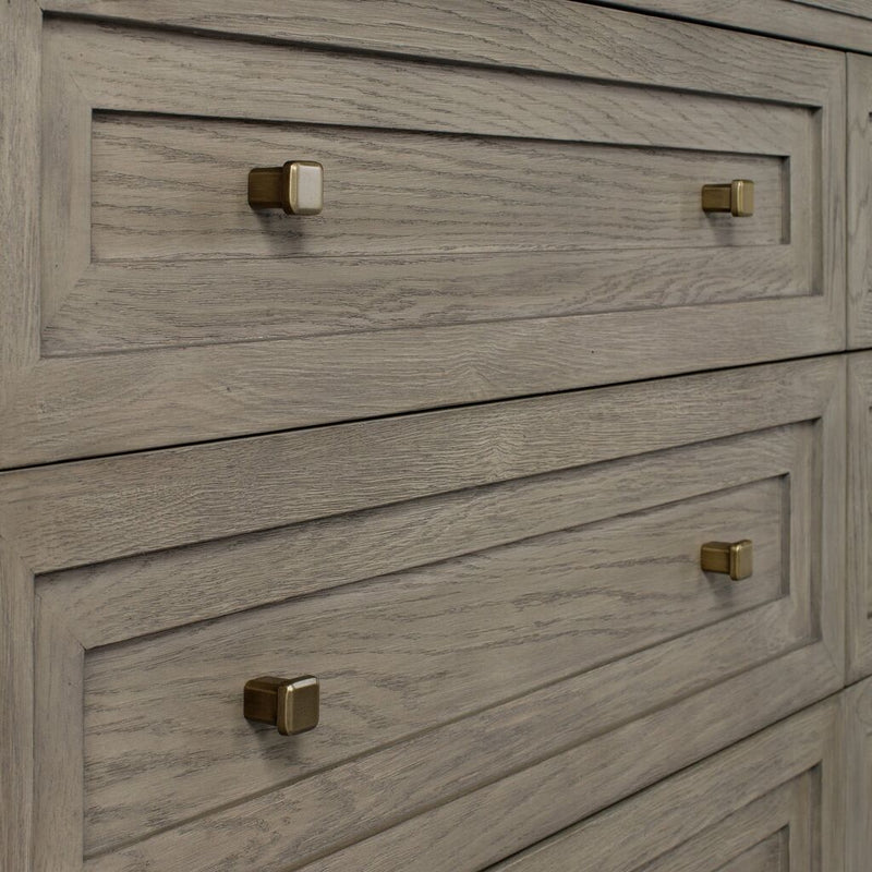 Part of the Claiborne Collection, this piece alludes to a relaxed, casual aesthetic, constructed of open grain oak solids and veneers, featuring architectural layered framed doors that graduate to give a multi-step shadow box look. Faceted handles and square tapered feet are finished in a satin brass that contrasts nicely against the quartered oak, in a weathered taupe finish named Pebble gray. The top right hand drawer features a divided jewelry tray.