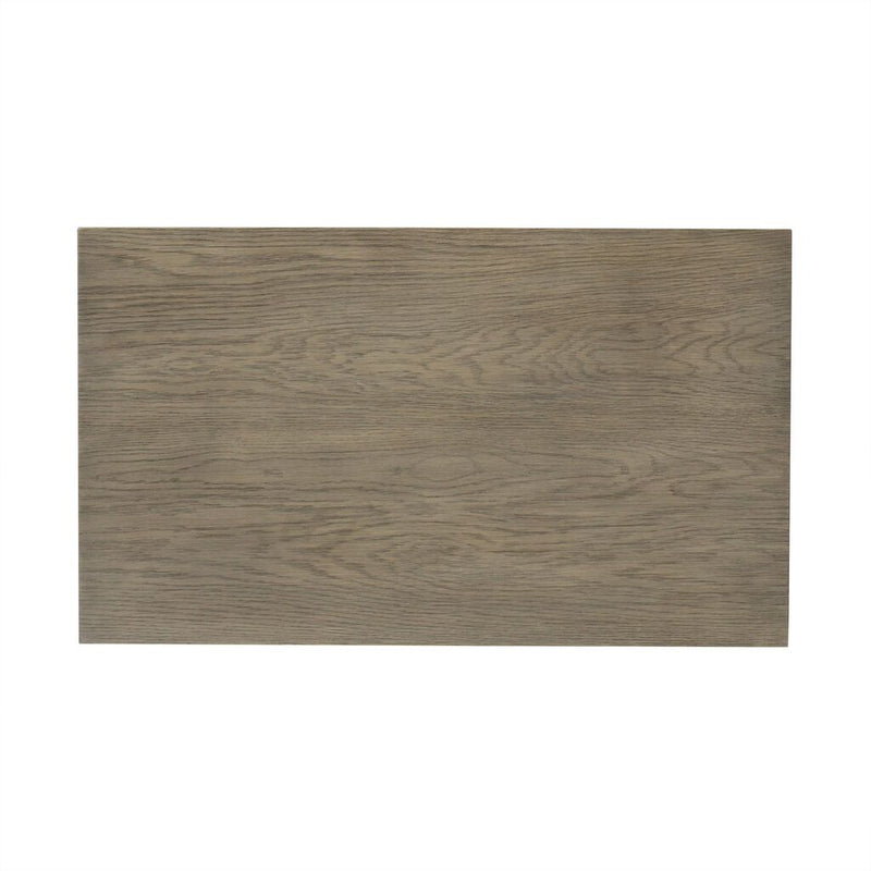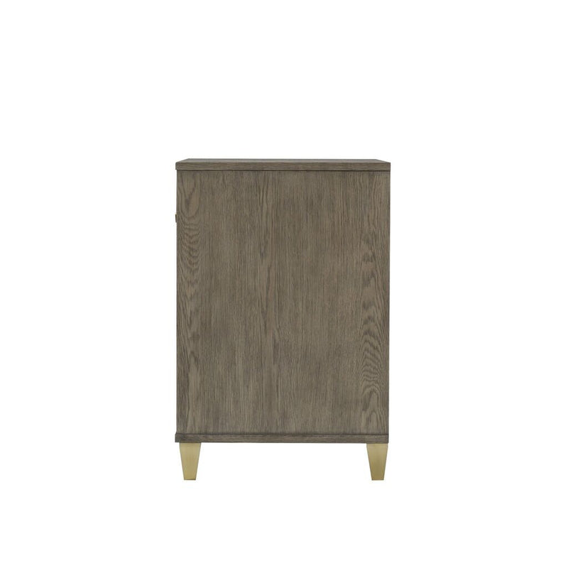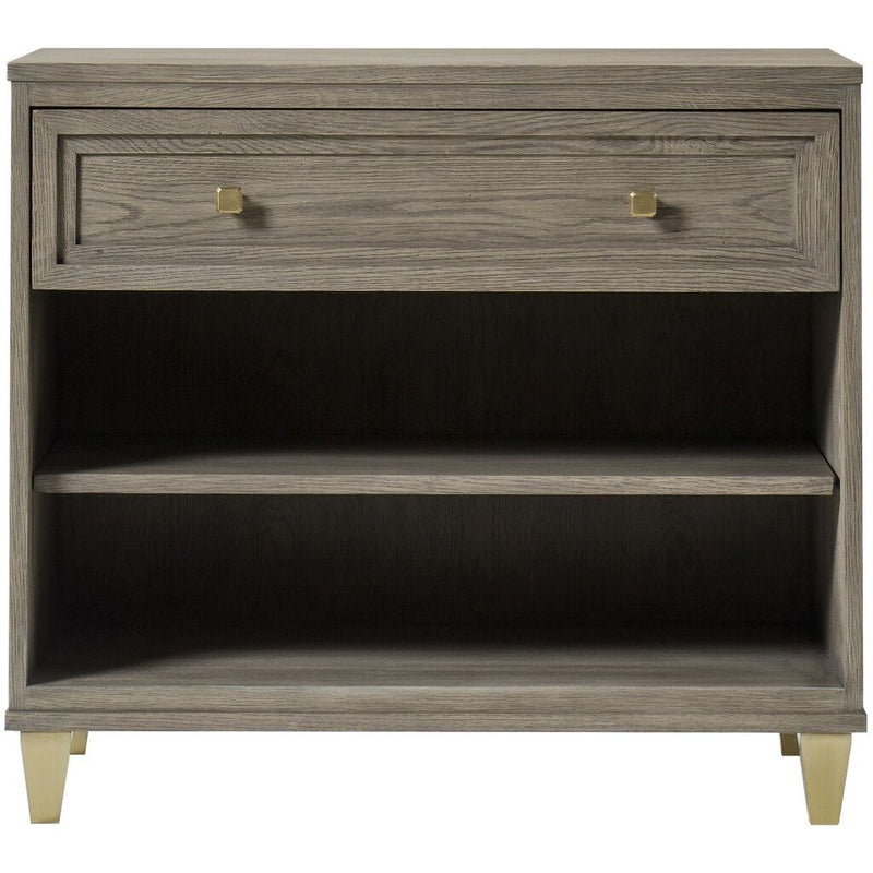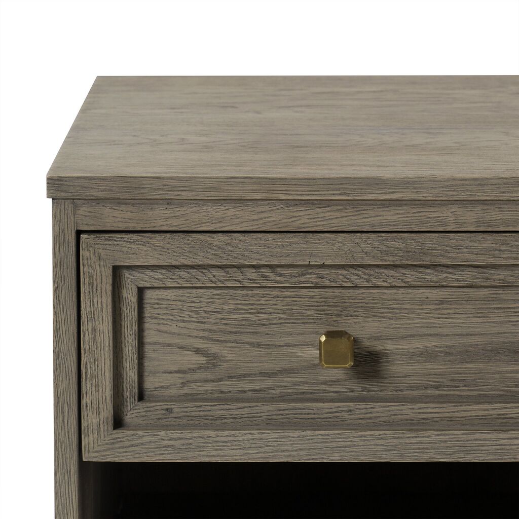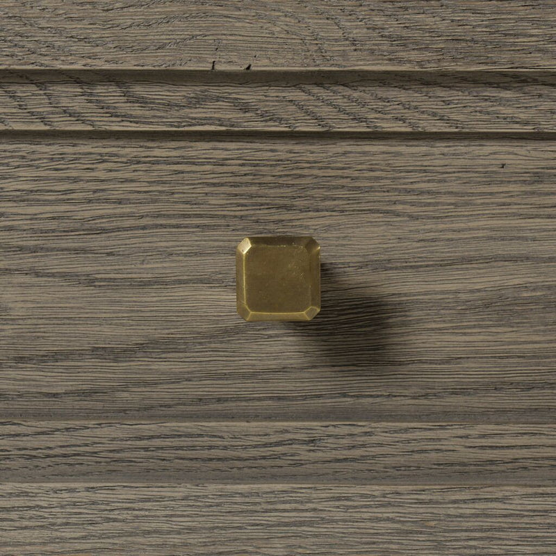 Part of the Claiborne Collection, this piece alludes to a relaxed, casual aesthetic, constructed of open grain oak solids and veneers, featuring architectural layered framed doors that graduate to give a multi-step shadow box look. Faceted handles and square tapered feet are finished in a satin brass that contrasts nicely against the quartered oak, in a weathered taupe finish named Pebble gray.