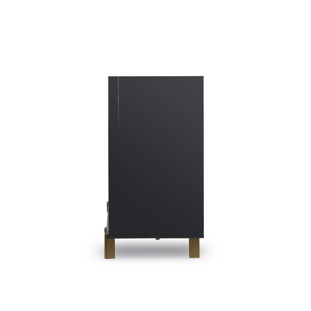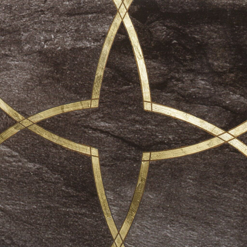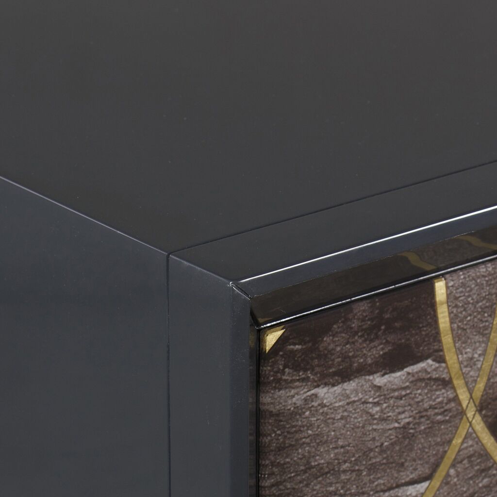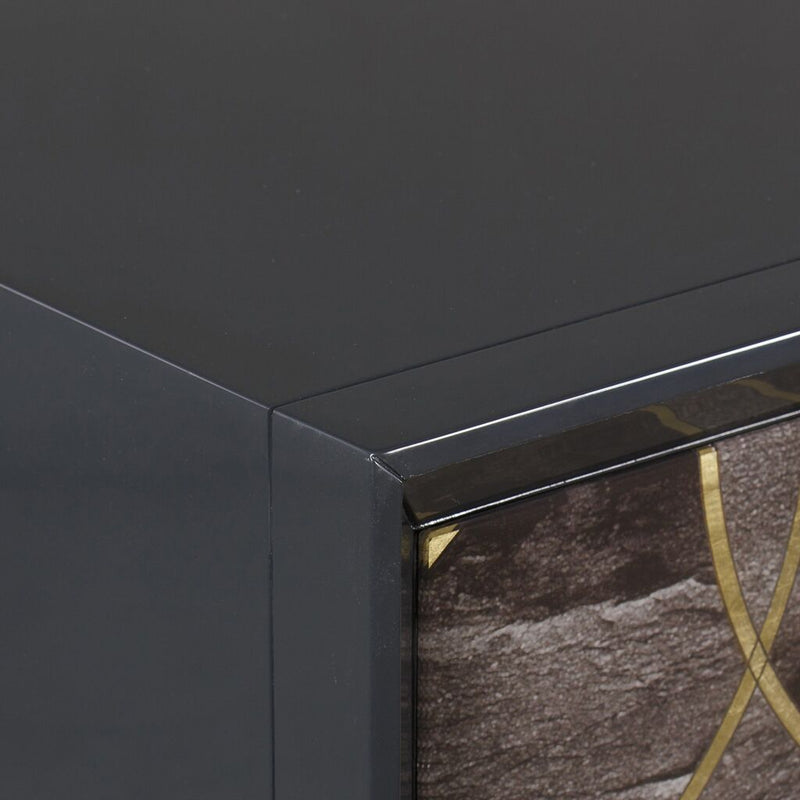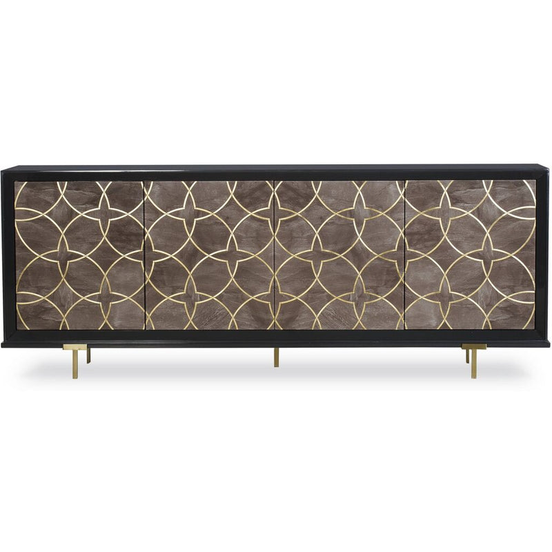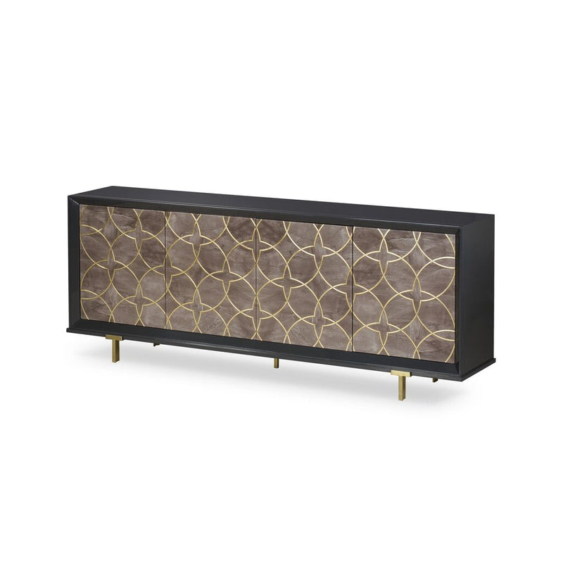 The Cohen is a handsome, statement credenza featuring a deep bevel wood frame in a Cinder Lacquer finish. Three printed glass drawers feature a striking motif of interlocking gold leaf circles over a complimentary gray slate finish.