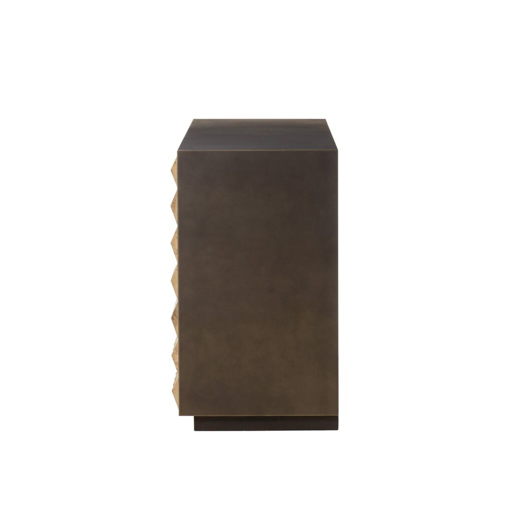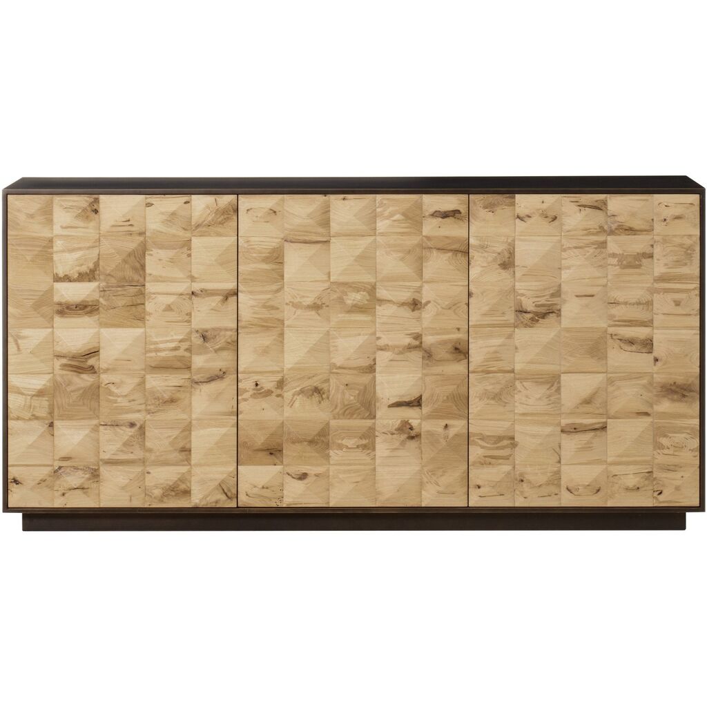 This spacious credenza is crafted from a cold rolled steel case finished in a rich bronze, with striking, reclaimed French oak doors, which are raised and faceted, highlighting an array of natural splits and graining. Available in different sizes.