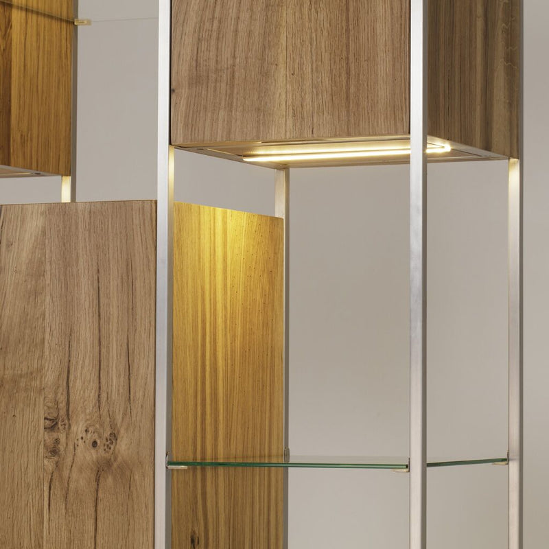 Modular in appearance and customizable by nature, this classically framed bookshelf is sporting some serious mid-century vibes. Employing a stainless steel frame and oak cabinets, designer Thomas Bina cleverly contrasts materials. Beautifully illuminated with inset LED lighting.