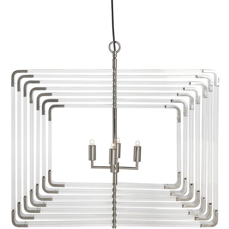 A signature Nellcote Studio piece, this light was created to be a mobile luminaire sculpture for the home. Crafted from a unique combination of polished acrylic and polished brass, each of the seven layers spins independently of the other, allowing for infinite configurations and design possibilities. Four candelabra sockets provide ample light, wrapped in matching solid brass or solid nickel.