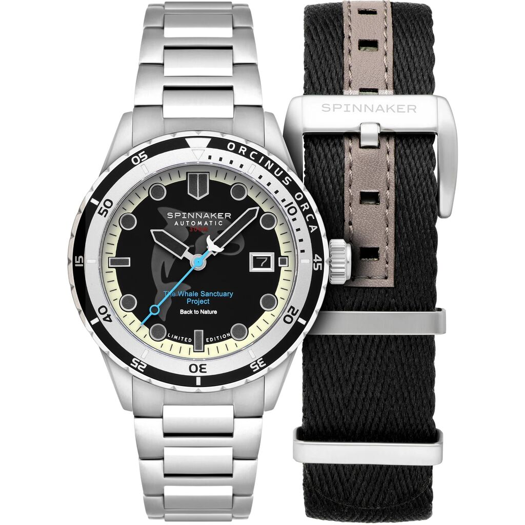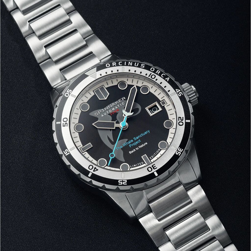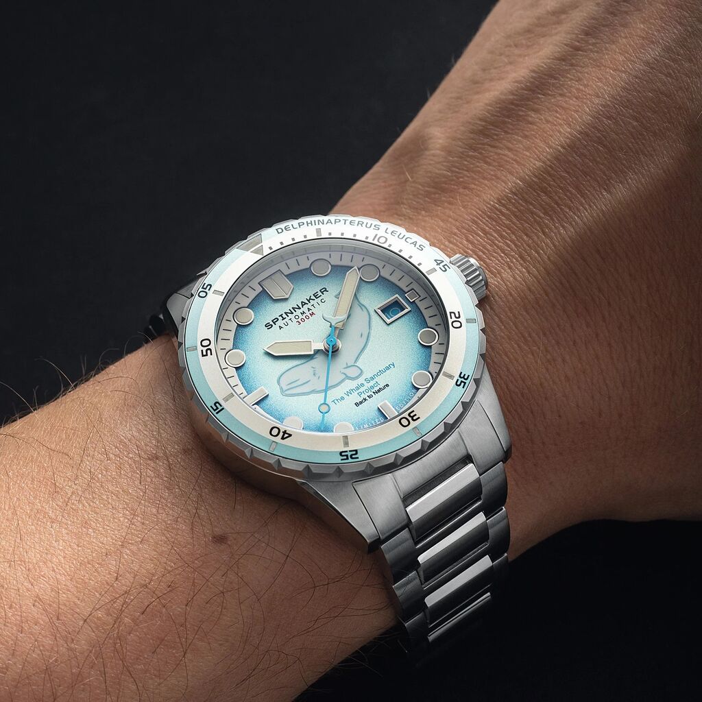 Discover the Hass Automatic Whale Sanctuary Project Limited Edition by Spinnaker, a timepiece that elegantly combines style with a deep appreciation for marine life. With a 43-millimeter stainless steel case and anti-reflection coated sapphire lens, this watch makes a bold statement while ensuring durability and clear visibility. The Japanese automatic movement and unidirectional turning bezel provide both precision and functionality. Its 300-meter water resistance makes it suitable for aquatic adventures. Plus, the 22-millimeter stainless steel strap with a secure fold-over buckle adds comfort and style. A symbol of your commitment to ocean conservation, this watch is a proud supporter of the Whale Sanctuary Project. Elevate your wristwear while contributing to the preservation of majestic whales and their habitat.