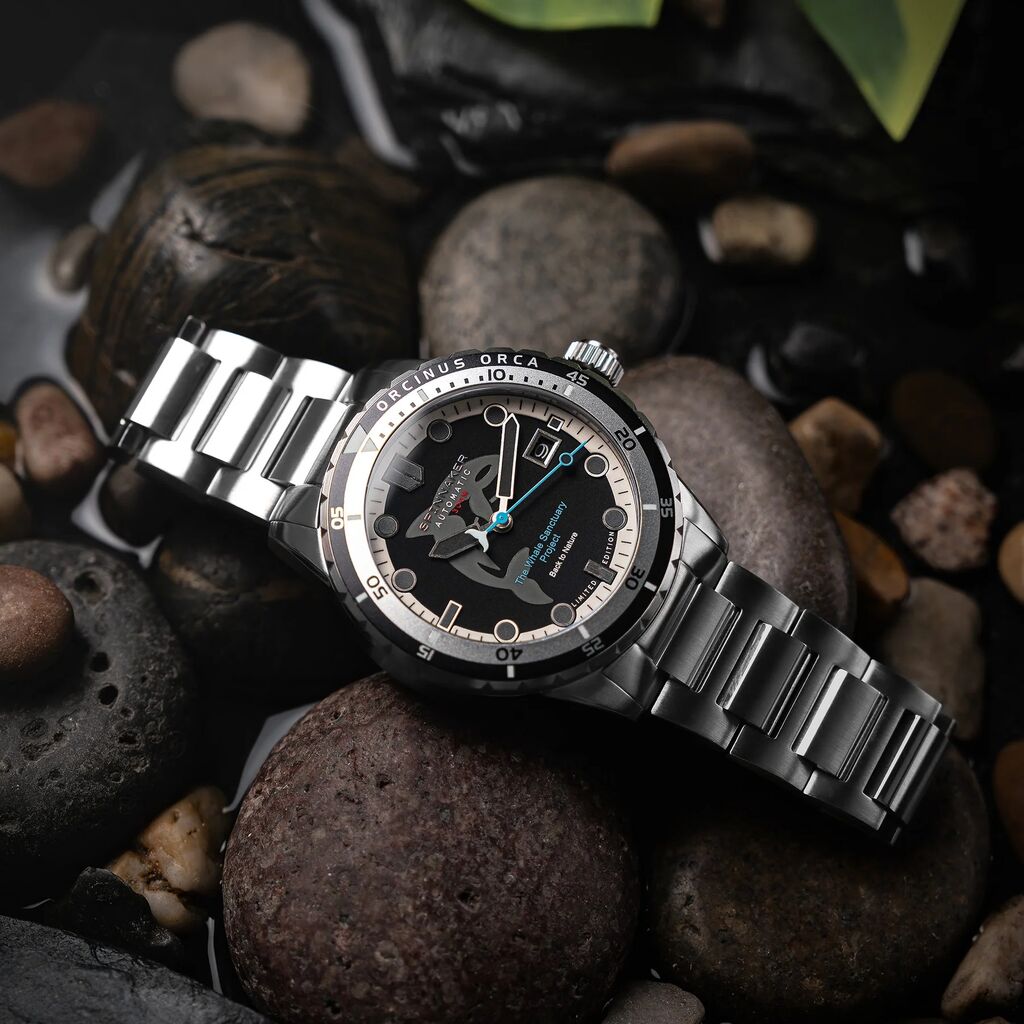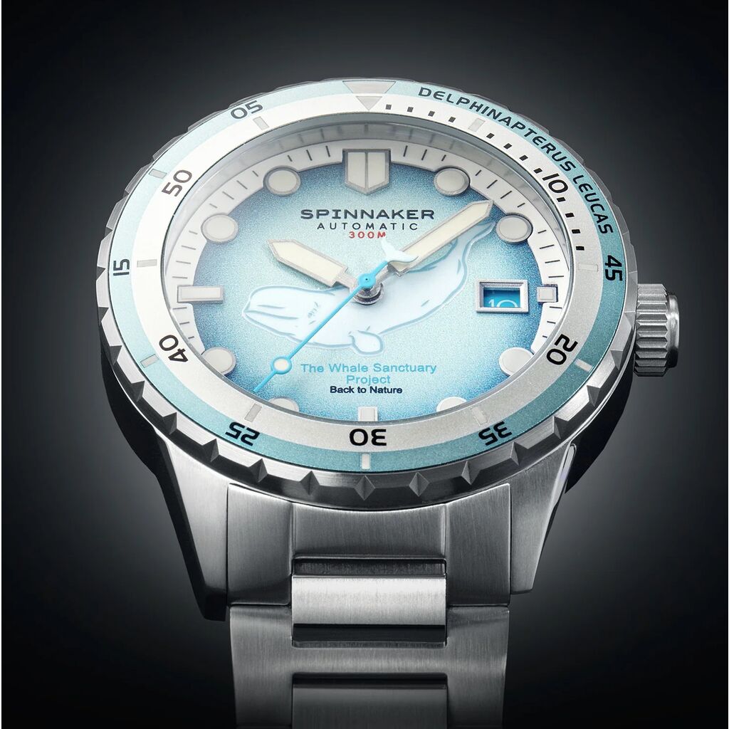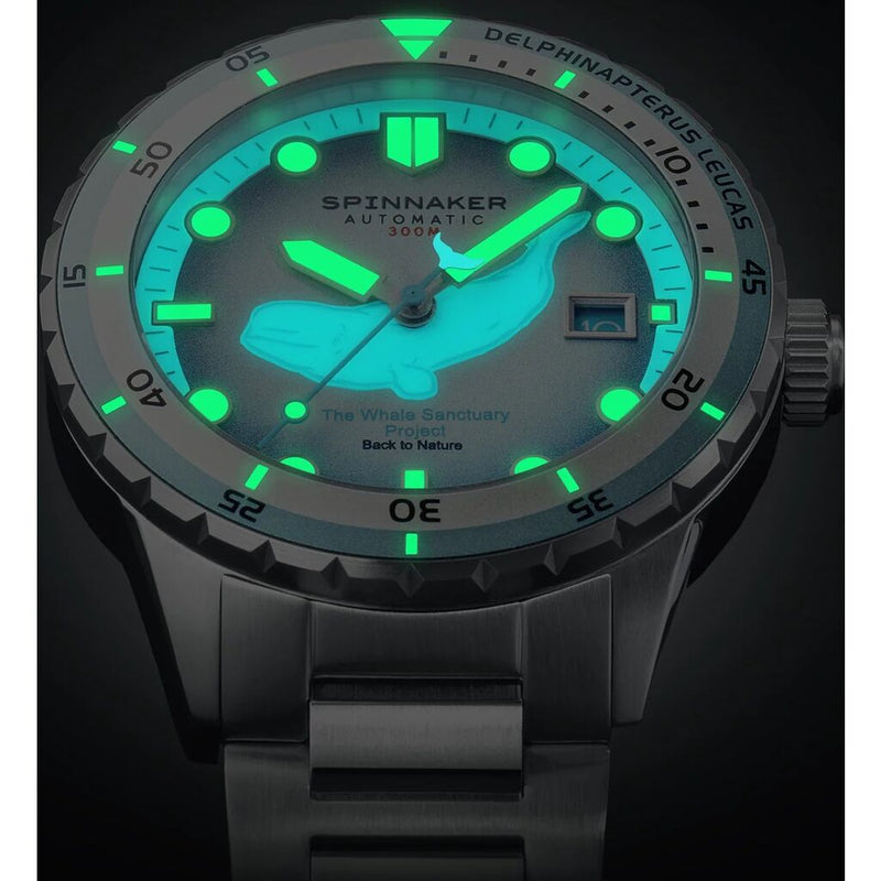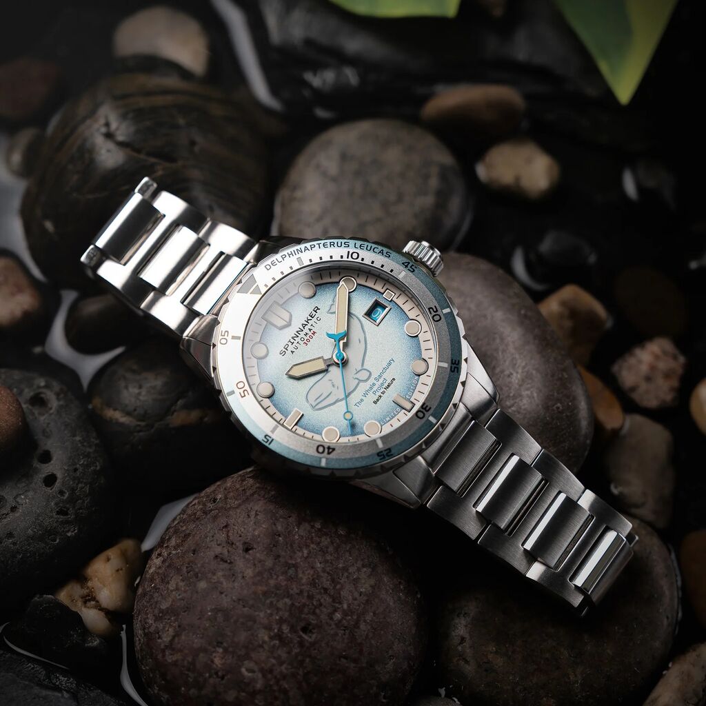 Discover the Hass Automatic Whale Sanctuary Project Limited Edition by Spinnaker, a timepiece that elegantly combines style with a deep appreciation for marine life. With a 43-millimeter stainless steel case and anti-reflection coated sapphire lens, this watch makes a bold statement while ensuring durability and clear visibility. The Japanese automatic movement and unidirectional turning bezel provide both precision and functionality. Its 300-meter water resistance makes it suitable for aquatic adventures. Plus, the 22-millimeter stainless steel strap with a secure fold-over buckle adds comfort and style. A symbol of your commitment to ocean conservation, this watch is a proud supporter of the Whale Sanctuary Project. Elevate your wristwear while contributing to the preservation of majestic whales and their habitat.