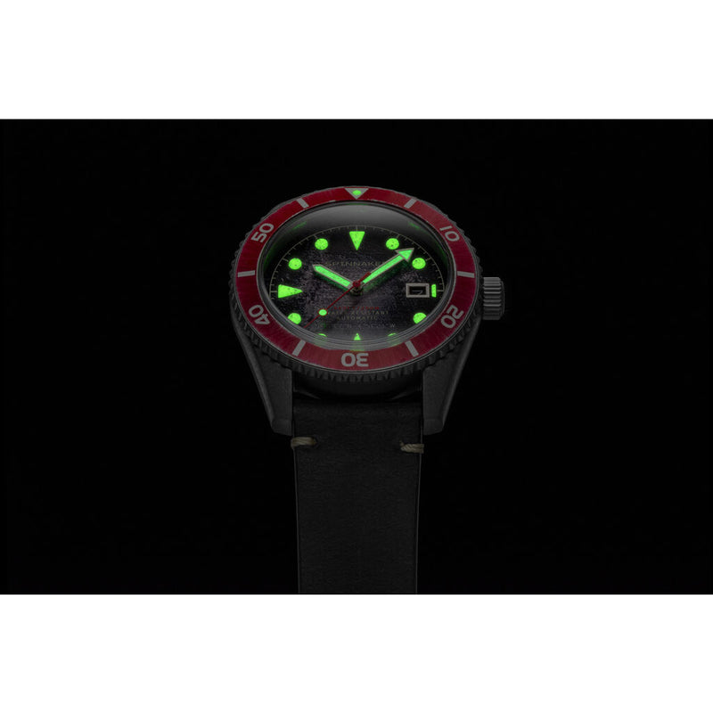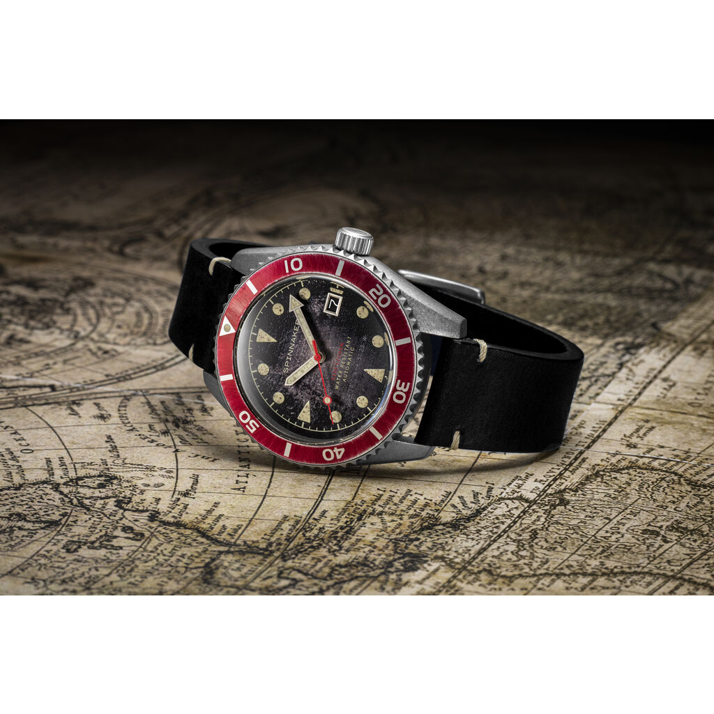 A distressed finish brings character and interest to a watch of substance. Updated and rebuilt to exacting standards, the Wreck infuses an element of fun, style, and history into a completely dependable automatically run divers watch. The essence of the Wreck lies in a dedication to hand-finishing every detail with tools such as blowtorches, acid baths, and just the right amount of oxidization to mimic the effect of nature’s own character-forming around manmade objects found at sea. The dial uses top-grade Swiss Super-LumiNova for its indexes ensuring excellent visibility in lower light conditions.