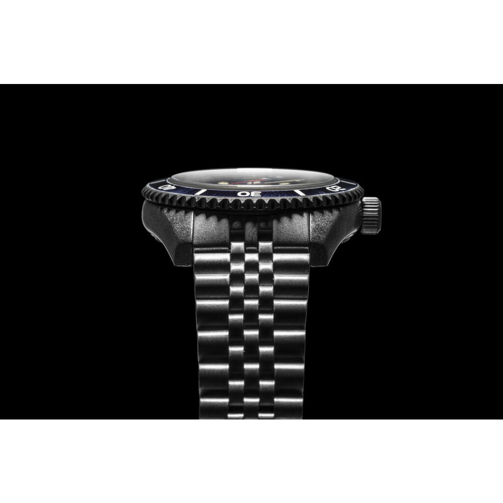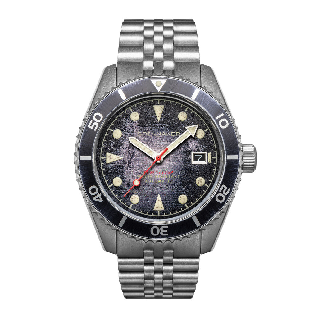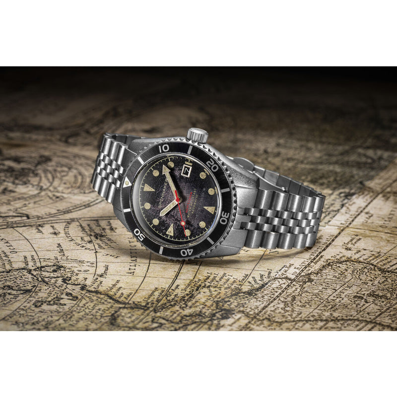 A distressed finish brings character and interest to a watch of substance. Updated and rebuilt to exacting standards, the Wreck infuses an element of fun, style, and history into a completely dependable automatically run divers watch. The essence of the Wreck lies in a dedication to hand-finishing every detail with tools such as blowtorches, acid baths, and just the right amount of oxidization to mimic the effect of nature’s own character-forming around manmade objects found at sea. The dial uses top-grade Swiss Super-LumiNova for its indexes ensuring excellent visibility in lower light conditions.