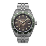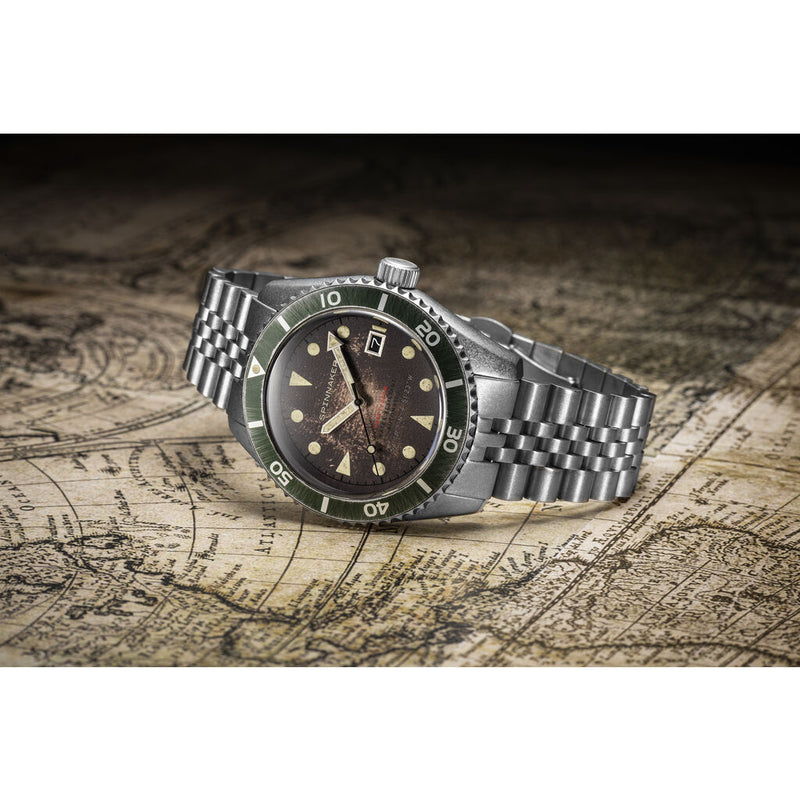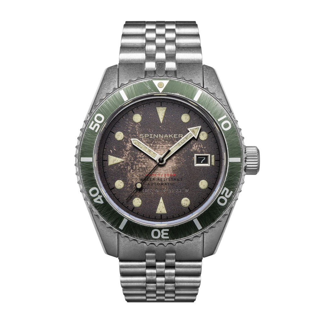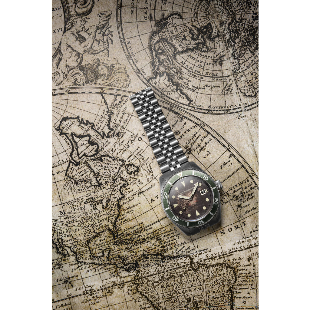 A distressed finish brings character and interest to a watch of substance. Updated and rebuilt to exacting standards, the Wreck infuses an element of fun, style, and history into a completely dependable automatically run divers watch. The essence of the Wreck lies in a dedication to hand-finishing every detail with tools such as blowtorches, acid baths, and just the right amount of oxidization to mimic the effect of nature’s own character-forming around manmade objects found at sea. The dial uses top-grade Swiss Super-LumiNova for its indexes ensuring excellent visibility in lower light conditions.